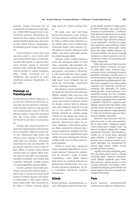 Kronik pulmoner emboli vakalar›n›n ço¤u eski akut embolik epizodlar›ndan ortaya ç›kar. Kronik pulmoner tromboembolik hastal›kl› bireylerin ço¤u geçmiflte olan tromboembolik olay›n ve DVT’nin fark›nda de¤ildir. Neden baz› hastalarda akut olay sonras› emboli erimemektedir? Bunda birçok faktör rol oynamaktad›r. Örne¤in, akut embolik materyalin volümü litik mekanizmalar›n aktivasyonunda rol oynayabilir. Majör bir arteriyel dal›n total oklüzyonuna ba¤l› olarak, litik materyal yerine ulaflamaz ve buna ba¤l› olarak p›ht› tam eritilemez. Tekrarlayan embolilerde de erime tam olmayabilir. Di¤er sebepler embolinin içeri¤i ve yap›s› ile ilgili olabilir ve normal mekanizmalarla eritilemeyebilir (iyi organize fibröz trombüs, ya¤ veya tümör gibi.) veya litik mekanizmalar›n kendisinde sorun olabilir. Baz› gruplarda, hastalarda trombüs geliflimi için hiperkoagülobilite durumu olabilir. Genelde, pulmoner arterde p›ht› oturduktan sonra prosesler ifllemeye bafllar; 1fibröz septa ile ayr›lan çok say›da küçük endotelize kanallar oluflarak, p›ht› kanalize olmaya bafllar. 2- P›ht› yo¤un, solid bir kitleye do¤ru ilerler, fibröz konnektif doku oluflur ve kanalize olamayan p›ht›ya