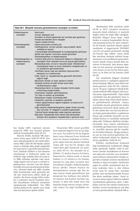 Tablo 69-1 Manyetik rezonans görüntülemenin avantajlar› ve limitleri Kateterizasyona avantajlar› Noninvaziv ‹onizan radyasyon yok Kaviteleri ve lümeni göstermek için kontrast ajan gerekmez Paralel devrelerdeki ak›m› hesaplar Yap›lar üstüste binmez Hasta boyutunda s›n›rlama yok Kalsifikasyonlar, cerrahi yamalar veya prostetik valvler artefakta yol açmaz Transözefagial ekokardiyografi ile k›yasland›¤›nda perfüzyon defekti olan alanlar› noninvaziv olarak görüntüler Ekokardiyografiye ve kataterizasyona Yüzlerce kalp at›m›n›n fonksiyonel datas›n›n ortalamas›n› al›r avantajlar› Rutin ifllemden sonra üç boyutlu görüntüleme Miyokardiyal doku ve kan›n manyetik olarak “etiketlenmesi” (miyokardiyal hasar ve duvar hareketinin hesaplanmas› ve h›z profillerinin görüntülenmesi) Ventriküler kavite veya kan damarlar› boyunca farkl› oktalarda h›z›n belirlenmesi Kütle, hacim vs. hesaplamas›nda geometrik tahminlere ba¤›ml› de¤il Miyokard›n fibrotik ve skarl› alanlar›n› belirler Kardiyak tümörler de dahil olmak üzere doku karakterizasyonu yapar Miyokardiyal demir ve oksijen düzeyleri (klinik olarak kullan›lmaya bafllanmakta) Pacemakerl› hastalar› görüntüleyemez Tel, klips ve koillere ait arterfaktlar Respirasyon imajlar› bulan›klaflt›rabilir Haraketsiz uzanmak ve sedasyon gereklidir Y›llard›r gelifltirilmesine ra¤men kapaklar ve korda s›n›rl› görüntülenebilir Ço¤u çal›flma elektrokardiyograma ‘gated’ olmak zorunda, baz› durumlar “R” dalgalar›n› problemli gösterebilir Teçhizat büyük oldu¤undan yatak bafl›nda yap›lamaz Bas›nçlar› hesaplamak klinik olarak hala deneyseldir; türbulan ak›m gradiyent hesaplamalar›n› güvensiz k›lar