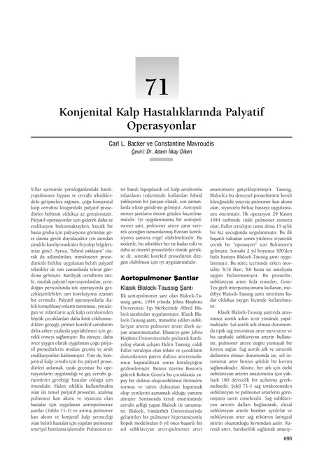 Y›llar içerisinde yenido¤anlardaki kardiyopulmoner bypass ve cerrahi tekniklerdeki geliflmelere ra¤men, ço¤u konjenital kalp cerrahisi kitap›ndaki palyatif prosedürler bölümü oldukça az genifllemifltir. Palyatif operasyonlar için giderek daha az endikasyon bulunmaktayken, küçük bir hasta grubu için palyasyona görünüfle göre daima gerek duyulacakt›r (en az›ndan flimdiki kardiyovasküler fizyoloji bilgilerimize göre). Ayr›ca, “hibrid yaklafl›m” olarak da adland›r›lan, transkateter prosedürlerle birlikte uygulanan belirli palyatif teknikler de son zamanlarda tekrar gündeme gelmifltir. Kardiyak cerrahinin tarihi, mutlak palyatif operasyonlardan, yenido¤an periyodunda tek operasyonla gerçeklefltirilebilen tam koreksiyona uzanan bir evrimdir. Palyatif operasyonlarla iliflkili komplikasyonlar›n tan›nmas›, yenido¤an ve infantlar›n aç›k kalp cerrahisinden büyük çocuklardan daha kötü etkilenmedikleri gerçe¤i, primer korektif cerrahinin daha erken yafllarda yap›labilmesi için gerekli ivmeyi sa¤lam›flt›r. Bu süreçte, daha önce yayg›n olarak uygulanan ço¤u palyatif prosedürlerin modas› geçmifl ve art›k endikasyonlar› kalmam›flt›r. Yine de, konjenital kalp cerrah› için bu palyatif prosedürleri anlamak, uzak geçmiflte bu operasyonlar›n uyguland›¤› ve geç cerrahi giriflimlerin gerekti¤i hastalar oldu¤u için önemlidir. Halen s›kl›kla kullan›lmakta olan iki temel palyatif prosedür, azalm›fl pulmoner kan ak›m› ve siyanozu olan hastalar için uygulanan aortopulmoner flantlar (Tablo 71-1) ve artm›fl pulmoner kan ak›m› ve konjestif kalp yetmezli¤i olan belirli hastalar için yap›lan pulmoner arteriyel bantlama ifllemidir. Pulmoner ar-