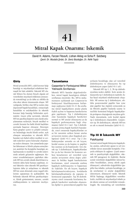 ‹skemik MY’li hastalar de¤erlendirilirken, mitral kapak hastal›¤›n›n dikkatli s›n›flamas› önemlidir. Biz, MY’in mekanizmas›n› aç›klamak için Carpentier’in fonksiyonel klasifikasyonunu kullanmay› ye¤liyoruz (fiekil 41-1). Bu s›n›flama mitral kapakç›klar›n anular planla iliflkili aç›lma ve kapanma hareketlerine göre yap›lm›flt›r. Tip 1 disfonksiyonu olan hastalarda kapakç›k hareketleri normal ve MY anular dilatasyona ya da kapakç›k perforasyonuna ba¤l› oluflmufltur (fiekil 41-1 üst). Tip 2 disfonksiyonda artm›fl kapak hareketli hastalarda, sistol esnas›nda kapakç›klardan en az bir tanesinin serbest kenar› anulus seviyesinin üstüne ç›kar (kapakç›k prolapsusu) (fiekil 41-1 orta). Tip 2 disfonksiyondan sorumlu en s›k lezyon, kordal uzama ya da kopma ve papiller kas uzamas› ya da kopmas›d›r. Son olarak tip 3 disfonksiyon, kapakç›klardan bir ya da her ikisinin bir k›sm›n›n serbest kenarlar›n›n sol ventrikül içine anulus seviyesinin alt›na do¤ru çekilmesi ile birlikte kapak hareketlerinin k›s›tlanmas›, sistol esnas›nda azalm›fl kapakç›k mobilizasyonu ve kapanmas› ile iliflkilidir. En s›k lezyon, kapakç›k kal›nlaflmas›/retraksiyonu, kordalarda kal›nlaflma/k›salma/ya da yap›flma ve komissural yap›flmad›r. Tip 3b disfonksiyonu sistol esnas›nda k›s›tlanm›fl kapakç›k hareketleri taraf›ndan oluflturulur.Apikal ve posterolateral papiller kas
