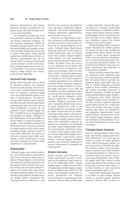 II Eriflkin Kalp Cerrahisi belirtileri olan intravenöz ilaç ba¤›ml›lar›nda, sa¤ tarafl› endokarditten flüphelenilmelidir. Transtorasik ekokardiyografi, triküspid endokarditin de¤erlendirilmesinde çok kesin sonuç verir. ‹ntravenöz ilaç ba¤›ml›lar›nda sa¤ tarafl› endokarditin cerrahi endikasyonlar›, sol tarafl› lezyonlar›n cerrahi cerrahi endikasyonlar› ile karfl›laflt›r›ld›¤›nda çok k›s›tl›d›r. Triküspid kapak düflük bas›nçl› dolafl›mda ortaya ç›kar ve bu yüzden bozulmufl fonksiyonlara daha iyi tolerans› vard›r. ‹kinci olarak, triküspid kapaktan emboli geliflimi, sol tarafl› kapaklardan geliflen embolizasyona göre daha az katastrofiktir. Ek olarak, devam eden intravenöz ilaç al›flkanl›¤› riski ile birlikte, HIV infeksiyonu yan› s›ra reinfeksiyon ve doz afl›m›n› içeren süregelen riskler, bu hastalarda cerrahiye konservatif yaklafl›lmas›n› zorunlu k›lar. Triküspid kapak endokarditi cerrahisi için iki önemli endikasyon: 1–Fungal organizmalar ya da antibiyotik tedavisine dirençli bakteriyel organizmalar›n neden oldu¤u endokardit, 2–Triküspid kapak vejetasyonu >2 cm, dilate sa¤ ventriküllü ve yineleyen pulmoner emboli ya da sa¤ kalp yetmezli¤i olan hastalard›r. Cerrahi gerekli oldu¤unda, enfekte dokunun debridman› ve do¤al kapa¤›n mümkün oldu¤unca korunmas› tercih edilir. Hastalarda s›kl›kla belirgin düzeyde kapak regürjitasyonu vard›r ve tam olarak kompetans›n restorasyonu olanaks›z olabilir. Devam edilen IV ilaç kullan›m›na ba¤l› olarak implante edilen prostetik kapa¤›n reinfeksiyon riski nedeniyle, baz› cerrahlar kapa¤›n tamamen eksizyonunu tercih etmektedirler. Eksizyon uygulanan baz› hastalarda, bir bölümünde acil olarak, düflük kardiyak debiye sekonder prostetik kapak yerlefltirilmesi ihtiyac› olacakt›r. Bazen yayg›n, septik pulmoner emboliye ba¤l› olarak de¤iflik derecelerde pulmoner hipertansiyon geliflen hastalar, triküspid kapa¤›n yoklu¤unu yeterince tolere edemezler. Replasman olmaks›z›n eksizyondan, bu hastalarda kaç›nmak gerekir. ve yelken fleklindedir. Anterior liflet göreceli olarak ince ve esnektir, ancak bunun yerine kal›nlaflm›fl ve muskülerize olabilir. Anterior lifletin kalitesi, Ebstein anomalisindeki kapak onar›m› denemelerinin baflar›s› için kritik öneme sahiptir. Kal›nlaflm›fl, muskülerize anterior liflet Ebstein onar›m› için yetersiz bir yap›d›r. Triküspid kapa¤›n Ebstein anomalisi, de¤iflik düzeylerde bir ciddiyet spektrumu gösterir ve hayat boyu herhangi bir zamanda klinik olarak belirgin bir hale gelebilir ve cerrahi giriflim gereksinimi olabilir. Neonatal dönemde, transplantasyon ya da tek-ventrikül palyasyonu (Starne’s prosedürü) gereksinimi olabilir. Daha hafif düzeyde Ebstein formu olan eriflkinler semptomatik hale gelebilirler ve cerrahi giriflim gerekebilir. Ebstein anomalisi semptomlar› gösteren eriflkinlerde aritmi, düflkünlük, dispne ve siyanozu içeren semptomlar görülebilir. Ek olarak, Ebstein anomalisi olan hastalarda atriyal septal defekt efllik edebilir ve sistemik dolafl›mda paradoksik emboli ile belirti verebilir. Ekokardiyografi valvüler yetersizli¤in derecesinin ve lifletlerin kalitesinin, özellikle de kapak onar›m› planland›¤›nda zaman, karakterize edilmesinde yararl› olabilir. Mümkün oldu¤unda kapak onar›m› kesinlikle tercih edilir, ancak baz› olgularda replasman gerekli olabilir. Ebstein için cerrahi gereksinimi olan, bilinen daha genç yafl grubundaki ço¤u eriflkin için, mekanik kapak replasman› düflünülmelidir. Literatürdeki bildiriler, biyoprostetik ve mekanik triküspid kapak replasman› uygulanan hastalarda, tromboembolizmi de içeren benzer komplikasyon oranlar›n› göstermektedir.