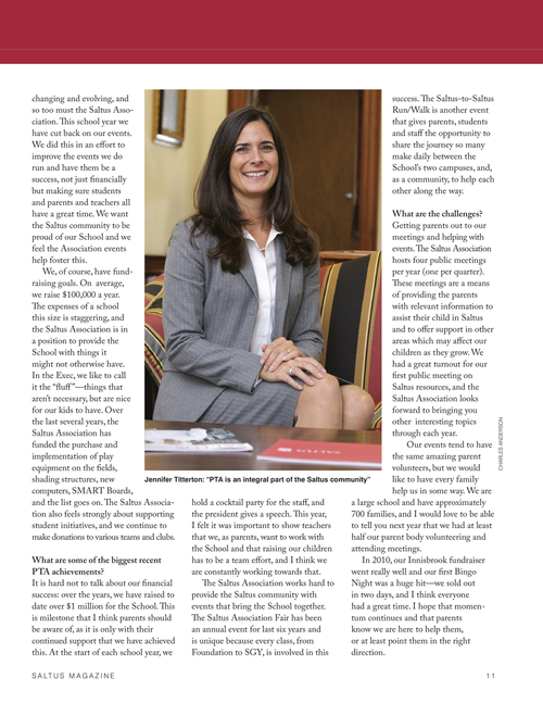 changing and evolving, and success. The Saltus-to-Saltus so too must the Saltus AssoRun/Walk is another event This school year we ciation. that gives parents, students have cut back on our events. and staff the opportunity to We did this in an effort to share the journey so many improve the events we do make daily between the run and have them be a School’s two campuses, and, success, not just financially as a community, to help each but making sure students other along the way. and parents and teachers all have a great time. We want What are the challenges? the Saltus community to be Getting parents out to our proud of our School and we meetings and helping with feel the Association events events. The Saltus Association help foster this. hosts four public meetings We, of course, have fundper year (one per quarter). raising goals. On average, These meetings are a means we raise $100,000 a year. of providing the parents The expenses of a school with relevant information to this size is staggering, and assist their child in Saltus the Saltus Association is in and to offer support in other a position to provide the areas which may affect our School with things it children as they grow. We might not otherwise have. had a great turnout for our In the Exec, we like to call first public meeting on it the “fluff ”—things that Saltus resources, and the aren’t necessary, but are nice Saltus Association looks for our kids to have. Over forward to bringing you the last several years, the other interesting topics Saltus Association has through each year. funded the purchase and Our events tend to have implementation of play the same amazing parent equipment on the fields, volunteers, but we would Jennifer Titterton: “PTA is an integral part of the Saltus community” shading structures, new like to have every family computers, SMART Boards, help us in some way. We are hold a cocktail party for the staff, and and the list goes on. The Saltus Associaa large school and have approximately the president gives a speech. This year, tion also feels strongly about supporting 700 families, and I would love to be able I felt it was important to show teachers student initiatives, and we continue to to tell you next year that we had at least that we, as parents, want to work with make donations to various teams and clubs. half our parent body volunteering and the School and that raising our children attending meetings. has to be a team effort, and I think we What are some of the biggest recent In 2010, our Innisbrook fundraiser are constantly working towards that. PTA achievements? went really well and our first Bingo The Saltus Association works hard to It is hard not to talk about our financial Night was a huge hit—we sold out provide the Saltus community with success: over the years, we have raised to in two days, and I think everyone events that bring the School together. date over $1 million for the School. This had a great time. I hope that momenThe Saltus Association Fair has been is milestone that I think parents should tum continues and that parents an annual event for last six years and be aware of, as it is only with their know we are here to help them, is unique because every class, from continued support that we have achieved or at least point them in the right Foundation to SGY, is involved in this this. At the start of each school year, we direction.