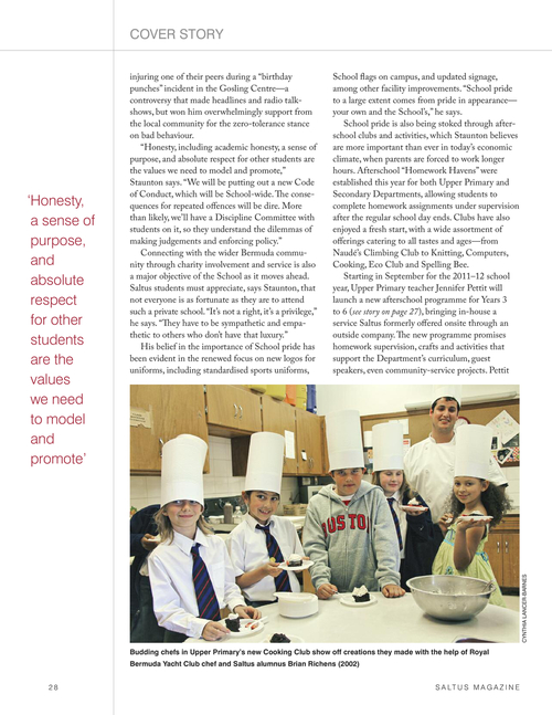 injuring one of their peers during a “birthday punches” incident in the Gosling Centre—a controversy that made headlines and radio talkshows, but won him overwhelmingly support from the local community for the zero-tolerance stance on bad behaviour. “Honesty, including academic honesty, a sense of purpose, and absolute respect for other students are the values we need to model and promote,” Staunton says. “We will be putting out a new Code of Conduct, which will be School-wide. The consequences for repeated offences will be dire. More than likely, we’ll have a discipline Committee with students on it, so they understand the dilemmas of making judgements and enforcing policy.” Connecting with the wider Bermuda community through charity involvement and service is also a major objective of the School as it moves ahead. Saltus students must appreciate, says Staunton, that not everyone is as fortunate as they are to attend such a private school. “It’s not a right, it’s a privilege,” he says. “They have to be sympathetic and empathetic to others who don’t have that luxury.” His belief in the importance of School pride has been evident in the renewed focus on new logos for uniforms, including standardised sports uniforms, School flags on campus, and updated signage, among other facility improvements. “School pride to a large extent comes from pride in appearance— your own and the School’s,” he says. School pride is also being stoked through afterschool clubs and activities, which Staunton believes are more important than ever in today’s economic climate, when parents are forced to work longer hours. Afterschool “Homework Havens” were established this year for both Upper Primary and Secondary departments, allowing students to complete homework assignments under supervision after the regular school day ends. Clubs have also enjoyed a fresh start, with a wide assortment of offerings catering to all tastes and ages—from Naudé’s Climbing Club to Knitting, Computers, Cooking, Eco Club and Spelling Bee. Starting in September for the 2011–12 school year, Upper Primary teacher Jennifer Pettit will launch a new afterschool programme for Years 3 to 6 (see story on page 27), bringing in-house a service Saltus formerly offered onsite through an outside company. The new programme promises homework supervision, crafts and activities that support the department’s curriculum, guest speakers, even community-service projects. Pettit