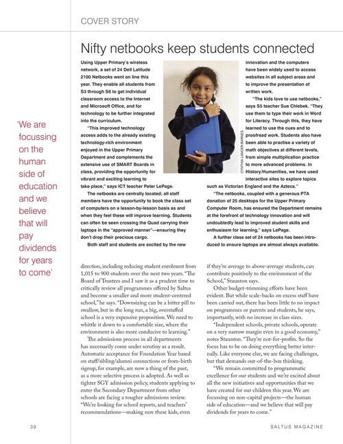 if they’re average to above-average students, can contribute positively to the environment of the School,” Staunton says. Other budget-trimming efforts have been evident. But while scale-backs on excess staff have been carried out, there has been little to no impact on programmes or parents and students, he says, importantly, with no increase in class sizes. “Independent schools, private schools, operate on a very narrow margin even in a good economy,” notes Staunton. “They’re not-for-profits. So the focus has to be on doing everything better internally. Like everyone else, we are facing challenges, but that demands out-of-the-box thinking. “We remain committed to programmatic excellence for our students and we’re excited about all the new initiatives and opportunities that we have created for our children this year. We are focussing on non-capital projects—the human side of education—and we believe that will pay dividends for years to come.”