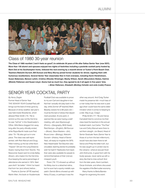 By Henry Ziegler Former Head of Senior Year THE SENIOR YEAR Cocktail Party still brings out the best of times gone by. Because of windy weather, last year’s was held inside Woodlands, which allowed Peter Smith (’75–’76) to remind us this was not the first time he was “full hot” in the Headmaster’s Office. Wife Maria dragged him away long after the party officially ended, while Pippa Barritt made sure Fred (also ’75–’76) also got out in one piece. The class was well represented, with Rick Manuel and Doug Hillen holding up the bar while Kevin “Hazard” Dill won the Long-Distance Award, having flown from Toronto. The Newcomer Award went to Linda Selley (Down), who made it for the first time, thus keeping the same percentage of attendance she earned in 1974. Next year she’ll “do better.” I think I’ve heard that from her (and others) before… Thanks to [former UP PE teacher] Martin Allen, the book on Academicals S A LT U S M A G A Z I N E Football Club was available to prove to my son Carl and daughter-in-law Kat that I actually did play back in the day, while [former UP teacher] Mark Beasley swears he is 69 years old— must be the lack of stress that department provided. At one point, it seemed like we were having a staff meeting, with Jean Myerscough (Pimm)—(Geography, BHS Head); Reid Kempe—(English), Bill Duncan —(Music), Steve Masters—(Art), Bruce Lines—(Biology), Malcolm Durrant—(History, Head of Senior Year), all ready to invigilate the SATs. New Headmaster Ted Staunton also circulated, learning stories he probably wish he hadn’t! Yearbooks from back then were also available for people to remind themselves of their (not-so) misspent youth. Fossi (’76–’77) showed up without his Moby due to a detached retina, but he sure had a sporty metallic eyepatch; Derrick Binns showed up with Nicky O’Leary, or perhaps it was the other way around. And Craig Tucker made his presence felt—much less of a man today than he was even a year ago (that I could have the same determination when it comes to keeping to a diet. Way to go, Craig!) Philip Smith (’77–’78) and Vance Campbell tried to convince me their class beat the teachers in the annual football match, but Carlos “The Flea” Lee and Cathy Manuel were there to set them straight. Jon Beard, Head of Senior Graduate Years (Senior Year to those of us from the last millennium), would have also been there to tell Vance and Philip the bitter truth, but he was caught up in London due to the volcano—what an excuse! Even John Edmunds, in good form with his lovely spouse, never came up with a story like that to miss school! And from the later years, Kevin Lambert, Oscar Andrade, and others discussed the vagaries of the Bermudian economy. Many thanks to Berta BarretoHogan for organising the event. 33