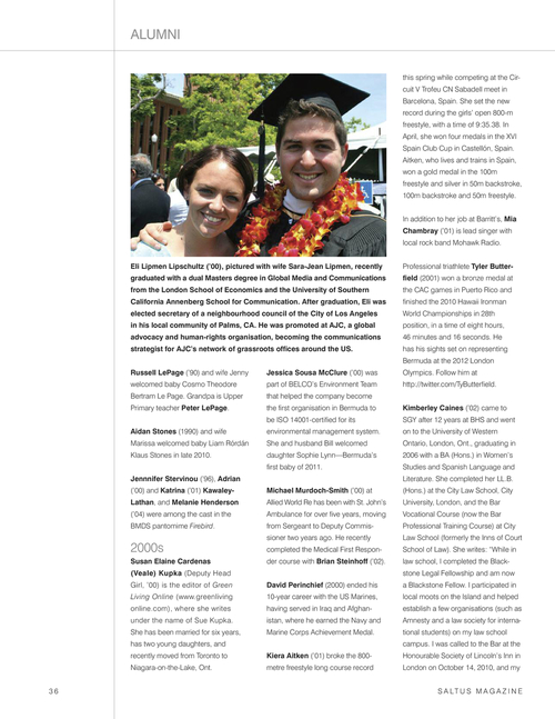 this spring while competing at the Circuit V Trofeu CN Sabadell meet in Barcelona, Spain. She set the new record during the girls’ open 800-m freestyle, with a time of 9:35.38. In April, she won four medals in the XVI Spain Club Cup in Castellón, Spain. Aitken, who lives and trains in Spain, won a gold medal in the 100m freestyle and silver in 50m backstroke, 100m backstroke and 50m freestyle. In addition to her job at Barritt’s, Mia Chambray (’01) is lead singer with local rock band Mohawk Radio. Eli Lipmen Lipschultz (’00), pictured with wife Sara-Jean Lipmen, recently graduated with a dual Masters degree in Global Media and Communications from the London School of Economics and the University of Southern California Annenberg School for Communication. After graduation, Eli was elected secretary of a neighbourhood council of the City of Los Angeles in his local community of Palms, CA. He was promoted at AJC, a global advocacy and human-rights organisation, becoming the communications strategist for AJC’s network of grassroots offices around the US. Russell LePage (’90) and wife Jenny welcomed baby Cosmo Theodore Bertram Le Page. Grandpa is Upper Primary teacher Peter LePage. Aidan Stones (1990) and wife Marissa welcomed baby Liam Rórdán Klaus Stones in late 2010. Jennnifer Stervinou (’96), Adrian (’00) and Katrina (’01) KawaleyLathan, and Melanie Henderson (’04) were among the cast in the BMDS pantomime Firebird. Michael Murdoch-Smith (’00) at Allied World Re has been with St. John’s Ambulance for over five years, moving from Sergeant to Deputy Commissioner two years ago. He recently completed the Medical First Responder course with Brian Steinhoff (’02). David Perinchief (2000) ended his 10-year career with the US Marines, having served in Iraq and Afghanistan, where he earned the Navy and Marine Corps Achievement Medal. Kiera Aitken (’01) broke the 800metre freestyle long course record Jessica Sousa McClure (’00) was part of BELCO’s Environment Team that helped the company become the first organisation in Bermuda to be ISO 14001-certified for its environmental management system. She and husband Bill welcomed daughter Sophie Lynn—Bermuda’s first baby of 2011. Kimberley Caines (’02) came to SGY after 12 years at BHS and went on to the University of Western Ontario, London, Ont., graduating in 2006 with a BA (Hons.) in Women’s Studies and Spanish Language and Literature. She completed her LL.B. (Hons.) at the City Law School, City University, London, and the Bar Vocational Course (now the Bar Professional Training Course) at City Law School (formerly the Inns of Court School of Law). She writes: “While in law school, I completed the Blackstone Legal Fellowship and am now a Blackstone Fellow. I participated in local moots on the Island and helped establish a few organisations (such as Amnesty and a law society for international students) on my law school campus. I was called to the Bar at the Honourable Society of Lincoln’s Inn in London on October 14, 2010, and my S A LT U S M A G A Z I N E Professional triathlete Tyler Butterfield (2001) won a bronze medal at the CAC games in Puerto Rico and finished the 2010 Hawaii Ironman World Championships in 28th position, in a time of eight hours, 46 minutes and 16 seconds. He has his sights set on representing Bermuda at the 2012 London Olympics. Follow him at http://twitter.com/TyButterfield.