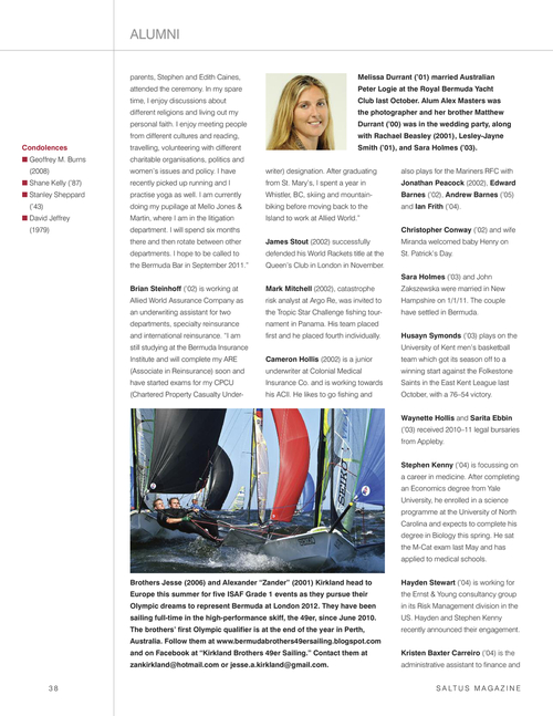 parents, Stephen and Edith Caines, attended the ceremony. In my spare time, I enjoy discussions about different religions and living out my personal faith. I enjoy meeting people from different cultures and reading, Condolences n Geoffrey M. Burns (2008) n Shane Kelly (’87) n Stanley Sheppard (’43) n David Jeffrey (1979) travelling, volunteering with different charitable organisations, politics and women’s issues and policy. I have recently picked up running and I practise yoga as well. I am currently doing my pupilage at Mello Jones & Martin, where I am in the litigation department. I will spend six months there and then rotate between other departments. I hope to be called to the Bermuda Bar in September 2011.” Brian Steinhoff (’02) is working at Allied World Assurance Company as an underwriting assistant for two departments, specialty reinsurance and international reinsurance. “I am still studying at the Bermuda Insurance Institute and will complete my ARE (Associate in Reinsurance) soon and have started exams for my CPCU (Chartered Property Casualty UnderCameron Hollis (2002) is a junior underwriter at Colonial Medical Insurance Co. and is working towards his ACII. He likes to go fishing and James Stout (2002) successfully defended his World Rackets title at the Queen’s Club in London in November. Sara Holmes (’03) and John Mark Mitchell (2002), catastrophe risk analyst at Argo Re, was invited to the Tropic Star Challenge fishing tournament in Panama. His team placed first and he placed fourth individually. Husayn Symonds (’03) plays on the University of Kent men’s basketball team which got its season off to a winning start against the Folkestone Saints in the East Kent League last October, with a 76–54 victory. Waynette Hollis and Sarita Ebbin (’03) received 2010–11 legal bursaries from Appleby. Stephen Kenny (’04) is focussing on a career in medicine. After completing an Economics degree from Yale University, he enrolled in a science programme at the University of North Carolina and expects to complete his degree in Biology this spring. He sat the M-Cat exam last May and has applied to medical schools. Brothers Jesse (2006) and Alexander “Zander” (2001) Kirkland head to Europe this summer for five ISAF Grade 1 events as they pursue their Olympic dreams to represent Bermuda at London 2012. They have been sailing full-time in the high-performance skiff, the 49er, since June 2010. The brothers’ first Olympic qualifier is at the end of the year in Perth, Australia. Follow them at www.bermudabrothers49ersailing.blogspot.com and on Facebook at “Kirkland Brothers 49er Sailing.” Contact them at zankirkland@hotmail.com or jesse.a.kirkland@gmail.com. 38 Kristen Baxter Carreiro (’04) is the administrative assistant to finance and S A LT U S M A G A Z I N E Hayden Stewart (’04) is working for the Ernst & Young consultancy group in its Risk Management division in the US. Hayden and Stephen Kenny recently announced their engagement. Zakszewska were married in New Hampshire on 1/1/11. The couple have settled in Bermuda. writer) designation. After graduating from St. Mary’s, I spent a year in Whistler, BC, skiing and mountainbiking before moving back to the Island to work at Allied World.” Christopher Conway (’02) and wife Miranda welcomed baby Henry on St. Patrick’s Day. also plays for the Mariners RFC with Jonathan Peacock (2002), Edward Barnes (’02), Andrew Barnes (’05) and Ian Frith (’04). Melissa Durrant (’01) married Australian Peter Logie at the Royal Bermuda Yacht Club last October. Alum Alex Masters was the photographer and her brother Matthew Durrant (’00) was in the wedding party, along with Rachael Beasley (2001), Lesley-Jayne Smith (’01), and Sara Holmes (’03).