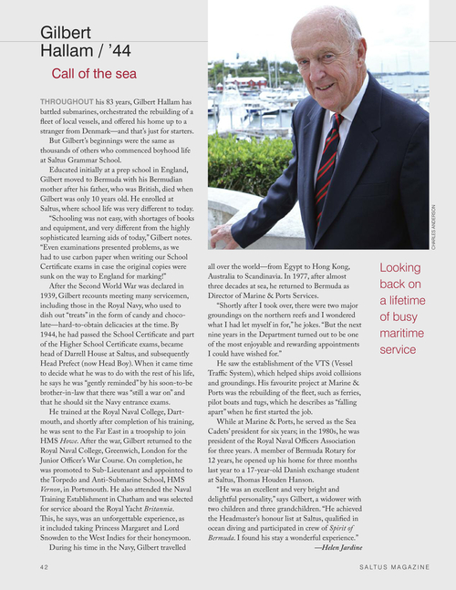 THROUGHOUT his 83 years, Gilbert Hallam has battled submarines, orchestrated the rebuilding of a fleet of local vessels, and offered his home up to a stranger from denmark—and that’s just for starters. But Gilbert’s beginnings were the same as thousands of others who commenced boyhood life at Saltus Grammar School. Educated initially at a prep school in England, Gilbert moved to Bermuda with his Bermudian mother after his father, who was British, died when Gilbert was only 10 years old. He enrolled at Saltus, where school life was very different to today. “Schooling was not easy, with shortages of books and equipment, and very different from the highly sophisticated learning aids of today,” Gilbert notes. “Even examinations presented problems, as we had to use carbon paper when writing our School Certificate exams in case the original copies were sunk on the way to England for marking!” After the Second World War was declared in 1939, Gilbert recounts meeting many servicemen, including those in the Royal Navy, who used to dish out “treats” in the form of candy and chocolate—hard-to-obtain delicacies at the time. By 1944, he had passed the School Certificate and part of the Higher School Certificate exams, became head of darrell House at Saltus, and subsequently Head Prefect (now Head Boy). When it came time to decide what he was to do with the rest of his life, he says he was “gently reminded” by his soon-to-be brother-in-law that there was “still a war on” and that he should sit the Navy entrance exams. He trained at the Royal Naval College, dartmouth, and shortly after completion of his training, he was sent to the Far East in a troopship to join HMS Howe. After the war, Gilbert returned to the Royal Naval College, Greenwich, London for the Junior Officer’s War Course. On completion, he was promoted to Sub-Lieutenant and appointed to the Torpedo and Anti-Submarine School, HMS Vernon, in Portsmouth. He also attended the Naval Training Establishment in Chatham and was selected for service aboard the Royal Yacht Britannia. This, he says, was an unforgettable experience, as it included taking Princess Margaret and Lord Snowden to the West Indies for their honeymoon. during his time in the Navy, Gilbert travelled