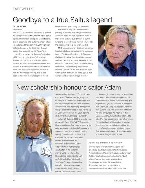 SALTUS alum and Spirit of Bermuda crewman Adam Goodwin died tragically in a motorcycle accident in October—less than two days after guiding 21 Saltus students and teachers on a week-long development voyage aboard the vessel. It was his first trip as Deck Officer aboard the youth-training ship of the Bermuda Sloop Foundation. Adam left Saltus in 2005 to spend a year at sea with Class Afloat’s STV Concordia. He then undertook four years of study at the Australia Maritime College in Tasmania, and spent extensive time at sea—including serving on Bermuda’s container ship Oleander. He successfully passed his oral examination for the Unlimited Watchkeepers Certificate of Proficiency, the highest qualification in the merchant marine world. He returned to Bermuda last September to work on Spirit and obtain additional “sea hours” towards his certification. Goodwin was also a keen fisherman with many catch-andrelease certificates to his credit. Adam’s love for the sea in his own words: Well my name’s Able Goodwin, a sailor am I on a three-masted sloop from the Bermuda Isle I’ve sailed the world over, north, south, east and west but the middle of nowhere’s where I like it best where it’s wave over wave, sea over bow, I’m as happy a man as the sea will allow There’s no other life for a sailor like me than to sail the salt sea, boys, sail the salt sea “He was gentle but strong. He was a fabulous mentor. His attitude, his approach, his professionalism, his empathy—he really was as good as it gets and we want to recognise that,” Bermuda Sloop Foundation Chairman Alan Burland said. The foundation’s Malcolm Kirkland announced the Adam Goodwin Marine/Mentor Scholarship had been established “to help educate and train other young Bermudian Spirit watch leaders to achieve world-class standards in the maritime field.” In a funeral ceremony officiated by the Rev. Nicholas Dill aboard Spirit of Bermuda, Adam was fittingly buried at sea.