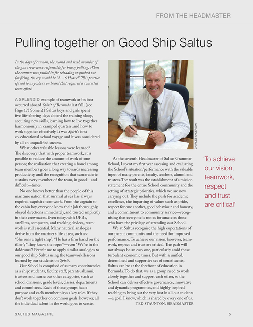 In the days of cannon, the second and sixth member of the gun crew were responsible for heavy pulling. When the cannon was pulled in for reloading or pushed out for firing, the cry would be “2…6 Heave!” This practice spread to anywhere on board that required a concerted team effort. A SPLENDID example of teamwork at its best occurred aboard Spirit of Bermuda last fall. (see Page 17) Some 21 Saltus boys and girls spent five life-altering days aboard the training sloop, acquiring new skills, learning how to live together harmoniously in cramped quarters, and how to work together effectively. It was Spirit’s first co-educational school voyage and it was considered by all an unqualified success. What other valuable lessons were learned? The discovery that with proper teamwork, it is possible to reduce the amount of work of one person; the realisation that creating a bond among team members goes a long way towards increasing productivity, and the recognition that camaraderie sustains every member of the team, in good—and difficult—times. No one knows better than the people of this maritime nation that survival at sea has always required exquisite teamwork. From the captain to the cabin boy, everyone knew their job thoroughly, obeyed directions immediately, and trusted implicitly in their crewmates. Even today, with UPBs, satellites, computers, and tracking devices, teamwork is still essential. Many nautical analogies derive from the mariner’s life at sea, such as: “She runs a tight ship”; “He has a firm hand on the tiller”; “They know the ropes”—even “We’re in the doldrums”! Permit me to apply similar analogies to our good ship Saltus using the teamwork lessons learned by our students on Spirit. Our School is comprised of as many constituencies as a ship: students, faculty, staff, parents, alumni, trustees and numerous other categories, such as school divisions, grade levels, classes, departments and committees. Each of these groups has a purpose and each member plays a key role. If they don’t work together on common goals, however, all the individual talent in the world goes to waste.