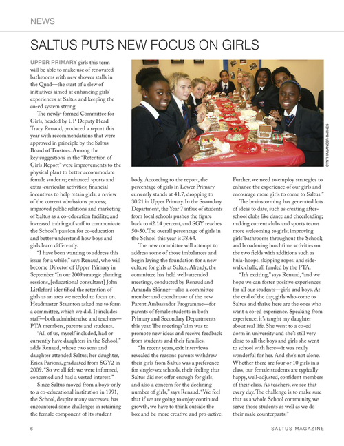UPPER PRIMARY girls this term will be able to make use of renovated bathrooms with new shower stalls in the Quad—the start of a slew of initiatives aimed at enhancing girls’ experiences at Saltus and keeping the co-ed system strong. The newly-formed Committee for Girls, headed by UP deputy Head Tracy Renaud, produced a report this year with recommendations that were approved in principle by the Saltus Board of Trustees. Among the key suggestions in the “Retention of Girls Report” were improvements to the physical plant to better accommodate female students; enhanced sports and extra-curricular activities; financial incentives to help retain girls; a review of the current admissions process; improved public relations and marketing of Saltus as a co-education facility; and increased training of staff to communicate the School’s passion for co-education and better understand how boys and girls learn differently. “I have been wanting to address this issue for a while,” says Renaud, who will become director of Upper Primary in September. “In our 2009 strategic planning sessions, [educational consultant] John Littleford identified the retention of girls as an area we needed to focus on. Headmaster Staunton asked me to form a committee, which we did. It includes staff—both administrative and teachers— PTA members, parents and students. “All of us, myself included, had or currently have daughters in the School,” adds Renaud, whose two sons and daughter attended Saltus; her daughter, Erica Parsons, graduated from SGY2 in 2009. “So we all felt we were informed, concerned and had a vested interest.” Since Saltus moved from a boys-only to a co-educational institution in 1991, the School, despite many successes, has encountered some challenges in retaining the female component of its student
