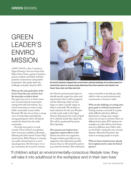 JANET SHAW, a Year 5 teacher in Upper Primary, is the new head of the Saltus Green Team, a group of teachers, parents, students and Saltus staff that promotes environment-saving habits and projects. She speaks about the challenges and plans ahead in 2011. What are the main goals/ideas of the Green Team this year, and how does the team plan to achieve them? Our goal every year is to foster awareness of environmental conservation among both staff and students. As a school community, we want to help build a sustainable society within Bermuda. We also aim to foster a strong sense of citizenship and leadership among participants which will spread outside the School into the wider community. Our long-term goal is to work towards “Green School” accreditation when it becomes available in Bermuda, following the Irish schools’ “Green Flag” award system. Elliot Primary is carrying out a pilot scheme based on a sevenstep programme. The first step is to set up a committee, the second to examine
