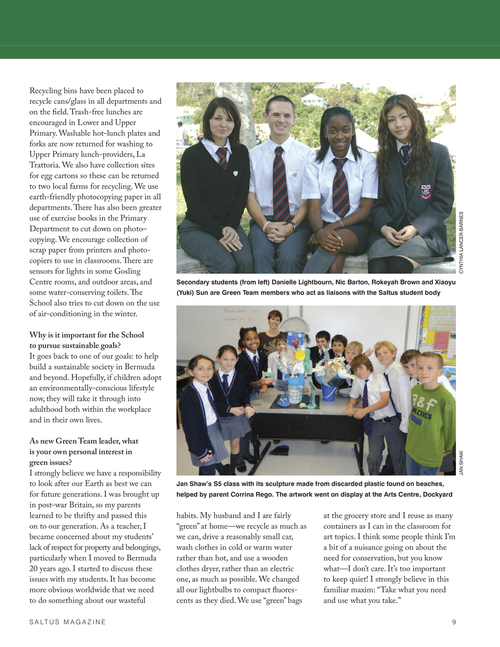 Recycling bins have been placed to recycle cans/glass in all departments and on the field. Trash-free lunches are encouraged in Lower and Upper Primary. Washable hot-lunch plates and forks are now returned for washing to Upper Primary lunch-providers, La Trattoria. We also have collection sites for egg cartons so these can be returned to two local farms for recycling. We use earth-friendly photocopying paper in all departments. There has also been greater use of exercise books in the Primary department to cut down on photo– copying. We encourage collection of scrap paper from printers and photocopiers to use in classrooms. There are sensors for lights in some Gosling Centre rooms, and outdoor areas, and some water-conserving toilets. The School also tries to cut down on the use of air-conditioning in the winter. Why is it important for the School to pursue sustainable goals? It goes back to one of our goals: to help build a sustainable society in Bermuda and beyond. Hopefully, if children adopt an environmentally-conscious lifestyle now, they will take it through into adulthood both within the workplace and in their own lives. As new Green Team leader, what is your own personal interest in green issues? I strongly believe we have a responsibility to look after our Earth as best we can for future generations. I was brought up in post-war Britain, so my parents learned to be thrifty and passed this on to our generation. As a teacher, I became concerned about my students’ lack of respect for property and belongings, particularly when I moved to Bermuda 20 years ago. I started to discuss these issues with my students. It has become more obvious worldwide that we need to do something about our wasteful