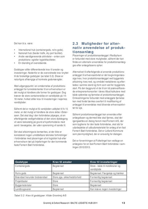 Godstyper stiller differentierede krav til arealer og investeringer. Nedenfor er de overordnede krav knyttet til de forskellige godstyper (se tabel 3.2). Disse er naturligvis afhængige af konkrete godsmængder. Med udgangspunkt i en omdannelse af produktionsanlægget for tunnelelementer til en erhvervshavn er det muligt at håndtere alle former for godstyper. Dog kræver de store containerskibe en vanddybde på 1418 meter, hvilket stiller krav til investeringer i kajernes vanddybder. Såfremt det er muligt at få vandybden uddybet til fx 15 meter, er det muligt at håndtere de store skibe i Østersøen. Det skal dog i den forbindelse påpeges, at en efterfølgende vedligeholdelse af den store dybdegang vil være bekostelig på grund af kystforholdene med sand i bevægelse, der uden oprensning vil sande til. Det skal afslutningsvis bemærkes, at der ikke er konstateret nogen umiddelbare tekniske forhindringer i forbindelse med placeringen af et logistisk hub eller erhvervshavn tæt på linjeføringen for den kommende faste Femern Bælt forbindelse.