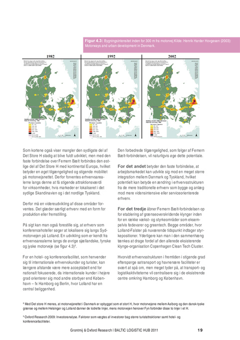 Som kortene også viser mangler den sydligste del af Det Store H stadig at blive fuldt udviklet, men med den faste forbindelse over Femern Bælt forbindes den østlige del af Det Store H med kontinental Europa, hvilket betyder en øget tilgængelighed og stigende mobilitet på motorvejsnettet. Derfor forventes erhvervsarealerne langs denne at få stigende attraktionsværdi for virksomheder, hvis markeder er lokaliseret i det sydlige Skandinavien og i det nordlige Tyskland. Derfor må en videreudvikling af disse områder forventes. Det glæder særligt erhverv med en form for produktion eller fremstilling. På sigt kan man også forestille sig, at erhverv som konferencehoteller søger at lokalisere sig langs Sydmotorvejen på Lolland. En udvikling som er kendt fra erhvervsarealerne langs de øvrige sjællandske, fynske og jyske motorveje (se figur 4.3)9. For en hotel- og konferencefacilitet, som henvender sig til internationale erhvervskunder og turister, kan længere afstande være mere acceptabelt end for nationalt fokuserede, da internationale kunder i højere grad orienterer sig mod andre storbyer end København – fx Hamborg og Berlin, hvor Lolland har en central beliggenhed.