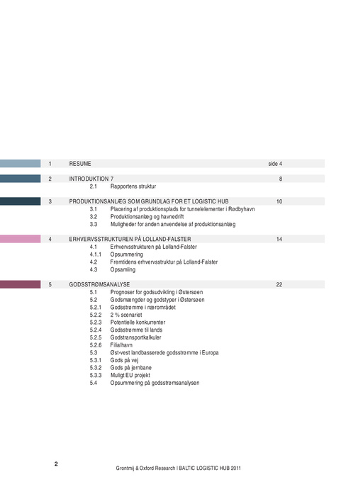 RESUME INTRODUKTION 7 2.1 Rapportens struktur PRODUKTIONSANLÆG SOM GRUNDLAG FOR ET LOGISTIC HUB 3.1 Placering af produktionsplads for tunnelelementer i Rødbyhavn 3.2 Produktionsanlæg og havnedrift 3.3 Muligheder for anden anvendelse af produktionsanlæg ERHVERVSSTRUKTUREN PÅ LOLLAND-FALSTER 4.1 Erhvervsstrukturen på Lolland-Falster 4.1.1 Opsummering 4.2 Fremtidens erhvervsstruktur på Lolland-Falster 4.3 Opsamling GODSSTRØMSANALYSE 5.1 Prognoser for godsudvikling i Østersøen 5.2 Godsmængder og godstyper i Østersøen 5.2.1 Godsstrømme i nærområdet 5.2.2 2 % scenariet 5.2.3 Potentielle konkurrenter 5.2.4 Godsstrømme til lands 5.2.5 Godstransportkalkuler 5.2.6 Filialhavn 5.3 Øst-vest landbasserede godsstrømme i Europa 5.3.1 Gods på vej 5.3.2 Gods på jernbane 5.3.3 Muligt EU projekt 5.4 Opsummering på godsstrømsanalysen