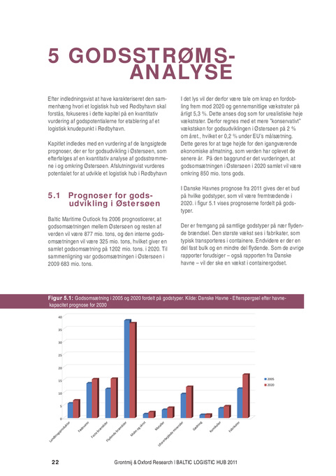 Efter indledningsvist at have karakteriseret den sammenhæng hvori et logistisk hub ved Rødbyhavn skal forstås, fokuseres i dette kapitel på en kvantitativ vurdering af godspotentialerne for etablering af et logistisk knudepunkt i Rødbyhavn. Kapitlet indledes med en vurdering af de langsigtede prognoser, der er for godsudvikling i Østersøen, som efterfølges af en kvantitativ analyse af godsstrømmene i og omkring Østersøen. Afslutningsvist vurderes potentialet for at udvikle et logistisk hub i Rødbyhavn I det lys vil der derfor være tale om knap en fordobling frem mod 2020 og gennemsnitlige vækstrater på årligt 5,3 %. Dette anses dog som for urealistiske høje vækstrater. Derfor regnes med et mere ”konservativt” vækstskøn for godsudviklingen i Østersøen på 2 % om året., hvilket er 0,2 % under EU’s målsætning. Dette gøres for at tage højde for den igangværende økonomiske afmatning, som verden har oplevet de senere år. På den baggrund er det vurderingen, at godsomsætningen i Østersøen i 2020 samlet vil være omkring 850 mio. tons gods. I Danske Havnes prognose fra 2011 gives der et bud på hvilke godstyper, som vil være fremtrædende i 2020. i figur 5.1 vises prognoserne fordelt på godstyper. Der er fremgang på samtlige godstyper på nær flydende brændsel. Den største vækst ses i fabrikater, som typisk transporteres i containere. Endvidere er der en del fast bulk og en mindre del flydende. Som de øvrige rapporter forudsiger – også rapporten fra Danske havne – vil der ske en vækst i containergodset.
