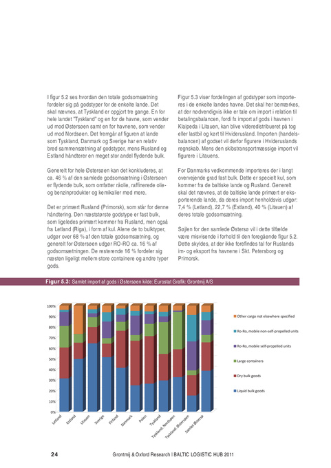 I figur 5.2 ses hvordan den totale godsomsætning fordeler sig på godstyper for de enkelte lande. Det skal nævnes, at Tyskland er opgjort tre gange. En for hele landet ”Tyskland” og en for de havne, som vender ud mod Østersøen samt en for havnene, som vender ud mod Nordsøen. Det fremgår af figuren at lande som Tyskland, Danmark og Sverige har en relativ bred sammensætning af godstyper, mens Rusland og Estland håndterer en meget stor andel flydende bulk. Generelt for hele Østersøen kan det konkluderes, at ca. 46 % af den samlede godsomsætning i Østersøen er flydende bulk, som omfatter råolie, raffinerede olieog benzinprodukter og kemikalier med mere. Det er primært Rusland (Primorsk), som står for denne håndtering. Den næststørste godstype er fast bulk, som ligeledes primært kommer fra Rusland, men også fra Letland (Riga), i form af kul. Alene de to bulktyper, udgør over 68 % af den totale godsomsætning, og generelt for Østersøen udgør RO-RO ca. 16 % af godsomsætningen. De resterende 16 % fordeler sig næsten ligeligt mellem store containere og andre typer gods.