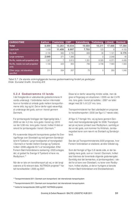 5.2.4 Godsstrømme til lands I det foregående er udelukkende godsstrømmene til vands undersøgt. I forbindelse med en intermodal havn er formålet at omlade gods mellem transportformerne skib, tog og bil. Det er derfor også væsentligt, at undersøge det gods, som er i transit gennem Danmark. For jernbanegods foreligger der tilgængeligt data. I 2009 var der 4,2 mio. tons gods i transit og i 2010 var der 5,98 mio. tons gods i transit, hvilket til dato er rekord for jernbanegods i transit i Danmark.14 På nuværende tidspunkt transporteres godset fra Sverige/Norge over Storebælt og ned igennem Sønderjylland til Tyskland. Langt hovedparten af transitgodset i Danmark er handel mellem Sverige og Tyskland, hvilket i 2008 udgjorde 63 % af transitgodset. Efter Femern Bælt-forbindelsens realisering i 2020 antages det, at godset fra Sverige til Tyskland vil køre via. Rødbyhavn.15 Når der er tale om transittransport på vej, er det langt sværere at få relevant data. NUTRADA-projektet16 har talt transitlastbiler i 2005 og 2007.