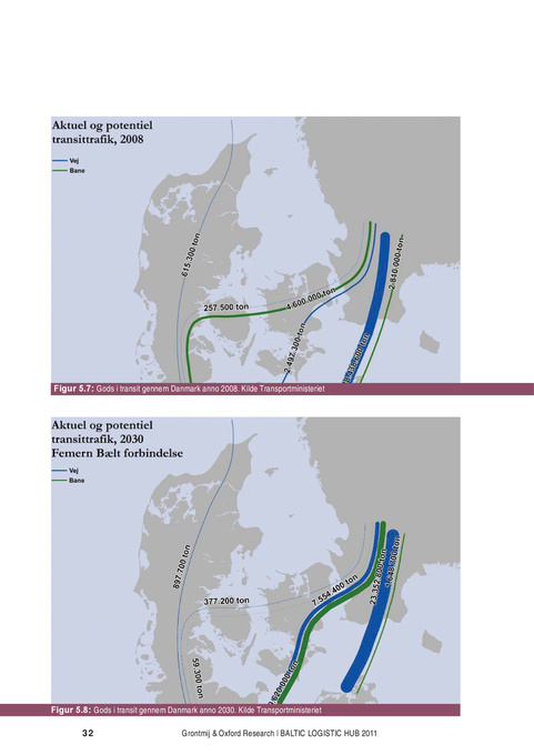 Figur 5.7: Gods i transit gennem Danmark anno 2008. Kilde Transportministeriet Figur 5.8: Gods i transit gennem Danmark anno 2030. Kilde Transportministeriet 32 Grontmij & Oxford Research | BALTIC LOGISTIC HUB 2011