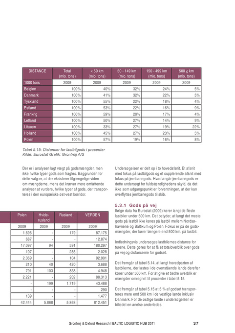 Undersøgelsen er delt op i to hovedafsnit. Et afsnit med fokus på lastbilgods og et supplerende afsnit med fokus på jernbanegods. Hvad angår jernbanegods er dette undersøgt for fuldstændighedens skyld, da det ikke som udgangspunkt er forventningen, at der kan overflyttes jernbanegods til skib. 5.3.1 Gods på vej Ifølge data fra Eurostat (2009) kører langt de fleste lastbiler under 500 km. Det betyder, at langt det meste gods på lastbil ikke køres på lastbil mellem Nordsøhavnene og Baltikum og Polen. Fokus er på de godsmængder, der kører længere end 500 km. på lastbil. Indledningsvis undersøges lastbilernes distance for turene. Dette gøres for at få et totaloverblik over gods på vej og distancerne for godset. Det fremgår af tabel 5.14, at langt hovedparten af lastbilerne, der lastes i de ovenstående lande derefter kører under 500 km. For at give et bedre overblik er mængder omregnet til procenter i tabel 5.15. Det fremgår af tabel 5.15 at 5 % af godset transporteres mere end 500 km i de vestlige lande inklusiv Danmark. For de østlige lande i undersøgelsen er billedet en anelse anderledes.