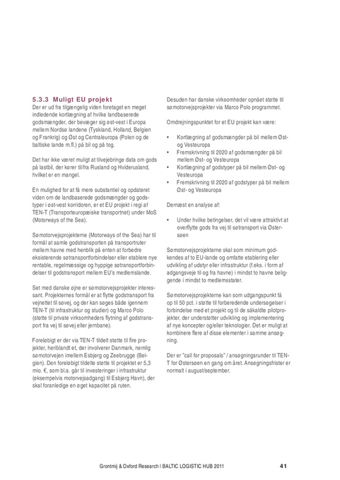 5.3.3 Muligt EU projekt Der er ud fra tilgængelig viden foretaget en meget indledende kortlægning af hvilke landbaserede godsmængder, der bevæger sig øst-vest i Europa mellem Nordsø landene (Tyskland, Holland, Belgien og Frankrig) og Øst og Centraleuropa (Polen og de baltiske lande m.fl.) på bil og på tog. Det har ikke været muligt at tilvejebringe data om gods på lastbil, der kører til/fra Rusland og Hviderusland, hvilket er en mangel. En mulighed for at få mere substantiel og opdateret viden om de landbaserede godsmængder og godstyper i øst-vest korridoren, er et EU projekt i regi af TEN-T (Transporteuropæiske transportnet) under MoS (Motorways of the Sea). Sømotorvejsprojekterne (Motorways of the Sea) har til formål at samle godstransporten på transportruter mellem havne med henblik på enten at forbedre eksisterende søtransportforbindelser eller etablere nye rentable, regelmæssige og hyppige søtransportforbindelser til godstransport mellem EU’s medlemslande. Set med danske øjne er sømotorvejsprojekter interessant. Projekternes formål er at flytte godstransport fra vejnettet til søvej, og der kan søges både igennem TEN-T (til infrastruktur og studier) og Marco Polo (støtte til private virksomheders flytning af godstransport fra vej til søvej eller jernbane). Foreløbigt er der via TEN-T tildelt støtte til fire projekter, heriblandt et, der involverer Danmark, nemlig sømotorvejen imellem Esbjerg og Zeebrugge (Belgien). Den foreløbigt tildelte støtte til projektet er 5,3 mio. €, som bl.a. går til investeringer i infrastruktur (eksempelvis motorvejsadgang) til Esbjerg Havn), der skal foranledige en øget kapacitet på ruten.