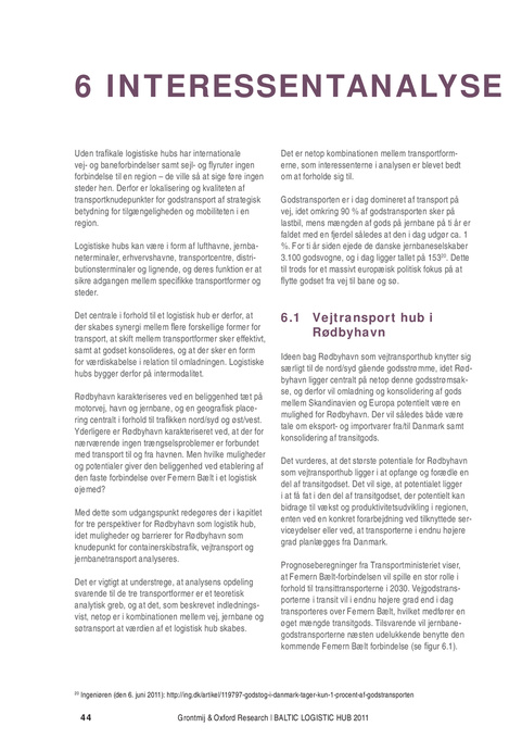 Uden trafikale logistiske hubs har internationale vej- og baneforbindelser samt sejl- og flyruter ingen forbindelse til en region – de ville så at sige føre ingen steder hen. Derfor er lokalisering og kvaliteten af transportknudepunkter for godstransport af strategisk betydning for tilgængeligheden og mobiliteten i en region. Logistiske hubs kan være i form af lufthavne, jernbaneterminaler, erhvervshavne, transportcentre, distributionsterminaler og lignende, og deres funktion er at sikre adgangen mellem specifikke transportformer og steder. Det centrale i forhold til et logistisk hub er derfor, at der skabes synergi mellem flere forskellige former for transport, at skift mellem transportformer sker effektivt, samt at godset konsolideres, og at der sker en form for værdiskabelse i relation til omladningen. Logistiske hubs bygger derfor på intermodalitet. Rødbyhavn karakteriseres ved en beliggenhed tæt på motorvej, havn og jernbane, og en geografisk placering centralt i forhold til trafikken nord/syd og øst/vest. Yderligere er Rødbyhavn karakteriseret ved, at der for nærværende ingen trængselsproblemer er forbundet med transport til og fra havnen. Men hvilke muligheder og potentialer giver den beliggenhed ved etablering af den faste forbindelse over Femern Bælt i et logistisk øjemed? Med dette som udgangspunkt redegøres der i kapitlet for tre perspektiver for Rødbyhavn som logistik hub, idet muligheder og barrierer for Rødbyhavn som knudepunkt for containerskibstrafik, vejtransport og jernbanetransport analyseres. Det er vigtigt at understrege, at analysens opdeling svarende til de tre transportformer er et teoretisk analytisk greb, og at det, som beskrevet indledningsvist, netop er i kombinationen mellem vej, jernbane og søtransport at værdien af et logistisk hub skabes. Det er netop kombinationen mellem transportformerne, som interessenterne i analysen er blevet bedt om at forholde sig til. Godstransporten er i dag domineret af transport på vej, idet omkring 90 % af godstransporten sker på lastbil, mens mængden af gods på jernbane på ti år er faldet med en fjerdel således at den i dag udgør ca. 1 %. For ti år siden ejede de danske jernbaneselskaber 3.100 godsvogne, og i dag ligger tallet på 15320. Dette til trods for et massivt europæisk politisk fokus på at flytte godset fra vej til bane og sø.