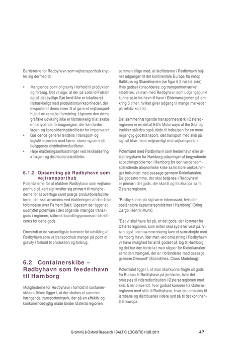 sammen tillige med, at faciliteterne i Rødbyhavn højner adgangen til det kontinentale Europa fra netop Baltikum og Skandinavien (se figur 6.2 næste side). Hvis godset konsolideres, og transportnetværket etableres, vil man med Rødbyhavn som udgangspunkt kunne sejle fra havn til havn i Østersøregionen på omkring 6 timer, hvilket giver adgang til mange markeder på relativ kort tid. Det sammenhængende transportnetværk i Østersøregionen er en del af EU’s Motorways of the Sea og trækker således også tråde til indsatsen for en mere miljørigtig godstransport, idet transport med skib på sigt vil blive mere miljøvenligt end vejtransporten. Potentialet med Rødbyhavn som feederhavn eller aflastningshavn for Hamborg udspringer af begyndende kapacitetsproblemer i Hamborg før den verdensomspændende økonomiske krise samt store omkostninger forbundet med passage gennem Kielerkanalen. De godsstrømme, der skal betjenes i Rødbyhavn er primært det gods, der skal til og fra Europa samt Østersøregionen. ”Rødby kunne på sigt være interessant, hvis der opstår store kapacitetsproblemer i Hamborg” (Bring Cargo, Henrik Munk) ”Det vi skal have fat på, er det gods, der kommer fra Østersøregionen, som enten skal syd eller vest på. Vi kan også i den sammenhæng lave et samarbejde med Hamborg Havn, idet man ved omlastning i Rødbyhavn vil have mulighed for at få godset på tog til Hamborg, og det har den fordel at man slipper for Kielerkanalen samt den trængsel, der er i forbindelse med passage gennem Øresund” (Scandlines, Claus Madelung). Potentialet ligger i, at man skal kunne fragte sit gods fra Europa til Rødbyhavn på jernbane, hvor det omlastes til videredistribution i Østersøregionen med skib. Eller omvendt, hvor godset kommer fra Østersøregionen med skib til Rødbyhavn, hvor det omlastes til jernbane og distribueres videre syd på til det kontinentale Europa.