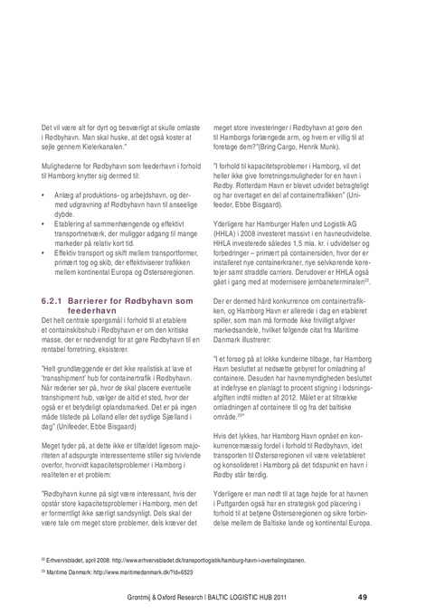 meget store investeringer i Rødbyhavn at gøre den til Hamborgs forlængede arm, og hvem er villig til at foretage dem?”(Bring Cargo, Henrik Munk). ”I forhold til kapacitetsproblemer i Hamborg, vil det heller ikke give forretningsmuligheder for en havn i Rødby. Rotterdam Havn er blevet udvidet betragteligt og har overtaget en del af containertrafikken” (Unifeeder, Ebbe Bisgaard). Yderligere har Hamburger Hafen und Logistik AG (HHLA) i 2008 investeret massivt i en havneudvidelse. HHLA investerede således 1,5 mia. kr. i udvidelser og forbedringer – primært på containersiden, hvor der er installeret nye containerkraner, nye selvkørende køretøjer samt straddle carriers. Derudover er HHLA også gået i gang med at modernisere jernbaneterminalen22. Der er dermed hård konkurrence om containertrafikken, og Hamborg Havn er allerede i dag en etableret spiller, som man må formode ikke frivilligt afgiver markedsandele, hvilket følgende citat fra Maritime Danmark illustrerer: ”I et forsøg på at lokke kunderne tilbage, har Hamborg Havn besluttet at nedsætte gebyret for omladning af containere. Desuden har havnemyndigheden besluttet at indefryse en planlagt to procent stigning i lodsningsafgiften indtil midten af 2012. Målet er at tiltrække omladningen af containere til og fra det baltiske område.23” Hvis det lykkes, har Hamborg Havn opnået en konkurrencemæssig fordel i forhold til Rødbyhavn, idet transporten til Østersøregionen vil være veletableret og konsolideret i Hamborg på det tidspunkt en havn i Rødby står færdig. Yderligere er man nødt til at tage højde for at havnen i Puttgarden også har en strategisk god placering i forhold til at betjene Østersøregionen og sikre forbindelse mellem de Baltiske lande og kontinental Europa.
