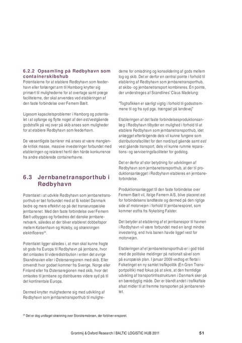 Potentialet i at udvikle Rødbyhavn som jernbanetransporthub er tæt forbundet med at få koblet Danmark bedre og mere effektivt op på det transeuropæiske jernbanenet. Med den faste forbindelse over Femern Bælt udbygges og forbedres det danske jernbanenetværk, således at der bliver etableret dobbeltspor mellem København og Holeby, og strækningen elektrificeres24. Potentialet ligger således i, at man skal kunne fragte sit gods fra Europa til Rødbyhavn på jernbane, hvor det omlastes til videredistribution i enten det øvrige Skandinavien eller i Østersøregionen med skib. Eller omvendt hvor godset kommer fra Sverige, Norge eller Finland eller fra Østersøregionen med skib, hvor det omlastes til jernbane og distribueres videre syd på til det kontinentale Europa. Dermed knytter mulighederne sig med udvikling af Rødbyhavn som jernbanetransporthub til mulighe-