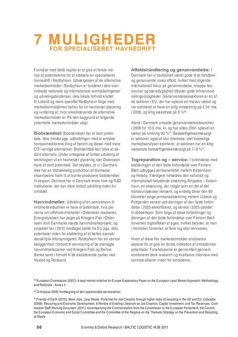 Formålet med dette kapitel er at give et første indtryk af potentialerne for at etablere en specialiseret havnedrift i Rødbyhavn. Udvælgelsen af de alternative markedsområder i Rødbyhavn er funderet i dels overordnede nationale og internationale rammebetingelser og udviklingstendenser, dels lokale forhold knyttet til Lolland og mere specifikt Rødbyhavn tillige med markedsområdernes behov for en havnenær placering og vurdering af, hvor arealkrævende de alternative markedsområder er. På den baggrund er følgende potentielle markedsområder valgt: Biobrændsel: Biobrændsler har et stort potentiale. Ikke mindst pga. udfordringen med at erstatte transportsektorens brug af benzin og diesel med mere CO2-venlige alternativer. Biobrændsel kan blive et sådant alternativ. Under antagelse af fortsat udvikling af teknologien vil en havnenær placering nær Østersøen have et stort potentiale. Det skyldes, at vi i Danmark ikke har en tilstrækkelig produktion af biomasse eksempelvis halm til at kunne producere biobrændsel til eksport. Derimod har vi Danmark know how og R&D institutioner, der kan sikre fortsat udvikling inden for området. Havvindmøller: Udvikling af en servicehavn til vindmølleindustrien vil have et potentiale, hvis planerne om offshorevindmøller i Østersøen realiseres. Energistyrelsen har peget på Kriegers Flak i Østersøen som Danmarks næste havvindmølleprojekt, og projektet har i 2010 modtaget støtte fra EU pga. dets potentialer inden for etablering af et fælles svensk/ dansk/tysk elforsyningsnet. Rødbyhavn har en central beliggenhed i forhold til servicering af de planlagte havvindmølleparker ved Kriegers Flak og Rønne Banke samt i forhold til de eksisterende parker ved Nysted og Rødsand. Affaldshåndtering og genanvendelse: I Danmark har vi traditionelt været gode til at håndtere og genanvende vores affald, hvilket med stigende internationalt fokus på genanvendelse, knappe ressourcer og bæredygtighed tilbyder gode erhvervsudviklingsmuligheder. Genanvendelsessektoren er én af de sektorer i EU, der har oplevet en massiv vækst og var estimeret at have en årlig omsætning på € 24 mia. i 2006, og årlig vækstrate på 8 %28. Alene i Danmark omsatte genanvendelsesbranchen i 2008 for 10.5 mia. kr. og har siden 2001 oplevet en vækst på omkring 90 %29. Beskæftigelsesmæssigt er sektoren også af stor interesse, idet forskellige markedsanalyser estimerer, at sektoren har en årlig vækstrate beskæftigelsesmæssigt på 7–9 %30. Togreparation og – service: I forbindelse med etableringen af den faste forbindelse over Femern Bælt udbygges jernbanenettet mellem København og Holeby. Yderligere forbedres den nationalt og internationalt betydende strækning Ringsted – København; en strækning, der indgår som en del af det transeuropæiske netværk, og endelig bliver den 89 kilometer lange jernbanestrækning mellem Lübeck og Puttgarden senest ved åbningen af den faste forbindelse i 2020 elektrificeret, og senest i 2025 udvidet til dobbeltspor. Som følge af disse forbedringer og åbningen af den faste forbindelse over Femern Bælt forventes togtrafikken at øges, hvilket betyder, at man i fremtiden forventer, at flere tog skal serviceres. Hvert af disse fire markedsområder analyseres separat for at give en første indikation af områdernes potentialer. Foranalyserne er gennemført gennem kombineret desk research og kvalitative interview med centrale aktører inden for områderne.