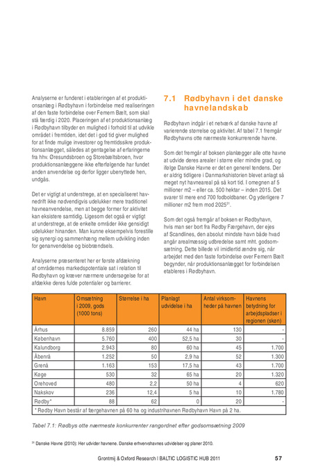 Rødbyhavn indgår i et netværk af danske havne af varierende størrelse og aktivitet. Af tabel 7.1 fremgår Rødbyhavns otte nærmeste konkurrerende havne. Som det fremgår af boksen planlægger alle otte havne at udvide deres arealer i større eller mindre grad, og ifølge Danske Havne er det en generel tendens. Der er aldrig tidligere i Danmarkshistorien blevet anlagt så meget nyt havneareal på så kort tid. I omegnen af 5 millioner m2 – eller ca. 500 hektar – inden 2015. Det svarer til mere end 700 fodboldbaner. Og yderligere 7 millioner m2 frem mod 202531. Som det også fremgår af boksen er Rødbyhavn, hvis man ser bort fra Rødby Færgehavn, der ejes af Scandlines, den absolut mindste havn både hvad angår arealmæssig udbredelse samt mht. godsomsætning. Dette billede vil imidlertid ændre sig, når arbejdet med den faste forbindelse over Femern Bælt begynder, når produktionsanlægget for forbindelsen etableres i Rødbyhavn.