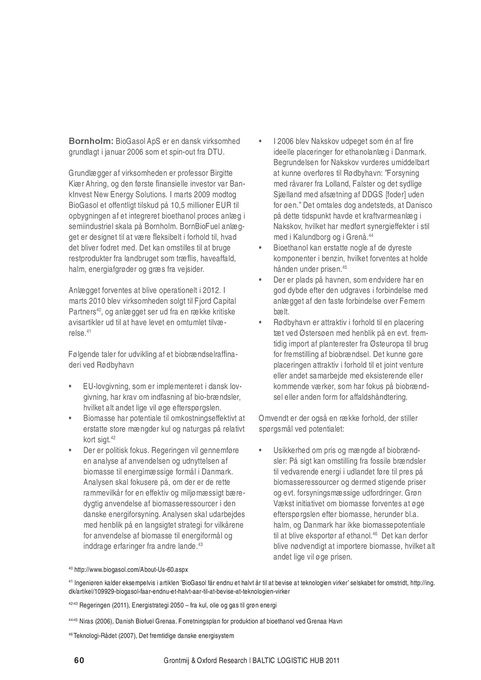 Bornholm: BioGasol ApS er en dansk virksomhed grundlagt i januar 2006 som et spin-out fra DTU. Grundlægger af virksomheden er professor Birgitte Kiær Ahring, og den første finansielle investor var BankInvest New Energy Solutions. I marts 2009 modtog BioGasol et offentligt tilskud på 10,5 millioner EUR til opbygningen af et integreret bioethanol proces anlæg i semiindustriel skala på Bornholm. BornBioFuel anlægget er designet til at være fleksibelt i forhold til, hvad det bliver fodret med. Det kan omstilles til at bruge restprodukter fra landbruget som træflis, haveaffald, halm, energiafgrøder og græs fra vejsider. Anlægget forventes at blive operationelt i 2012. I marts 2010 blev virksomheden solgt til Fjord Capital Partners40, og anlægget ser ud fra en række kritiske avisartikler ud til at have levet en omtumlet tilværelse.41 Følgende taler for udvikling af et biobrændselraffinaderi ved Rødbyhavn • • • EU-lovgivning, som er implementeret i dansk lovgivning, har krav om indfasning af bio-brændsler, hvilket alt andet lige vil øge efterspørgslen. Biomasse har potentiale til omkostningseffektivt at erstatte store mængder kul og naturgas på relativt kort sigt.42 Der er politisk fokus. Regeringen vil gennemføre en analyse af anvendelsen og udnyttelsen af biomasse til energimæssige formål i Danmark. Analysen skal fokusere på, om der er de rette rammevilkår for en effektiv og miljømæssigt bæredygtig anvendelse af biomasseressourcer i den danske energiforsyning. Analysen skal udarbejdes med henblik på en langsigtet strategi for vilkårene for anvendelse af biomasse til energiformål og inddrage erfaringer fra andre lande.43