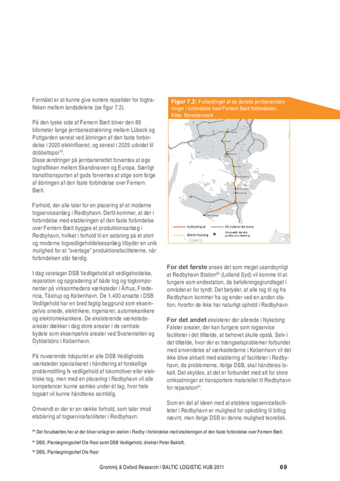 Formålet er at kunne give kortere rejsetider for togtrafikken mellem landsdelene (se figur 7.2). På den tyske side af Femern Bælt bliver den 89 kilometer lange jernbanestrækning mellem Lübeck og Puttgarden senest ved åbningen af den faste forbindelse i 2020 elektrificeret, og senest i 2025 udvidet til dobbeltspor79. Disse ændringer på jernbanenettet forventes at øge togtrafikken mellem Skandinavien og Europa. Særligt transittransporten af gods forventes at stige som følge af åbningen af den faste forbindelse over Femern Bælt. Forhold, der alle taler for en placering af et moderne togserviceanlæg i Rødbyhavn. Dertil kommer, at der i forbindelse med etableringen af den faste forbindelse over Femern Bælt bygges et produktionsanlæg i Rødbyhavn, hvilket i forhold til en satsning på et stort og moderne togvedligeholdelsesanlæg tilbyder en unik mulighed for at ”overtage” produktionsfaciliteterne, når forbindelsen står færdig. I dag varetager DSB Vedligehold alt vedligeholdelse, reparation og opgradering af både tog og togkomponenter på virksomhedens værksteder i Århus, Fredericia, Tåstrup og København. De 1.400 ansatte i DSB Vedligehold har en bred faglig baggrund som eksempelvis smede, elektrikere, ingeniører, automekanikere og elektromekanikere. De eksisterende værkstedsarealer dækker i dag store arealer i de centrale bydele som eksempelvis arealer ved Svanemøllen og Dybbølsbro i København. På nuværende tidspunkt er alle DSB Vedligholds værksteder specialiseret i håndtering af forskellige problemstilling fx vedligehold af lokomotiver eller elektriske tog, men med en placering i Rødbyhavn vil alle kompetencer kunne samles under ét tag, hvor hele togsæt vil kunne håndteres samtidig. Omvendt er der er en række forhold, som taler imod etablering af togservicefaciliteter i Rødbyhavn: