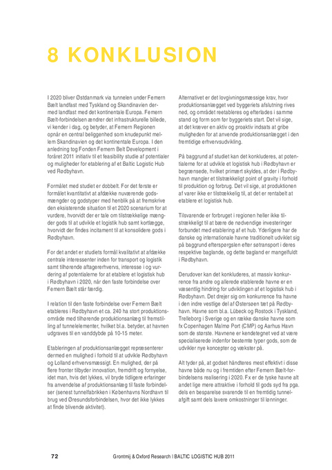 I 2020 bliver Østdanmark via tunnelen under Femern Bælt landfast med Tyskland og Skandinavien dermed landfast med det kontinentale Europa. Femern Bælt-forbindelsen ændrer det infrastrukturelle billede, vi kender i dag, og betyder, at Femern Regionen opnår en central beliggenhed som knudepunkt mellem Skandinavien og det kontinentale Europa. I den anledning tog Fonden Femern Belt Development i foråret 2011 initiativ til et feasibility studie af potentialer og muligheder for etablering af et Baltic Logistic Hub ved Rødbyhavn. Formålet med studiet er dobbelt. For det første er formålet kvantitativt at afdække nuværende godsmængder og godstyper med henblik på at fremskrive den eksisterende situation til et 2020 scenarium for at vurdere, hvorvidt der er tale om tilstrækkelige mængder gods til at udvikle et logistik hub samt kortlægge, hvorvidt der findes incitament til at konsolidere gods i Rødbyhavn. For det andet er studiets formål kvalitativt at afdække centrale interessenter inden for transport og logistik samt tilhørende aftagererhvervs, interesse i og vurdering af potentialerne for at etablere et logistisk hub i Rødbyhavn i 2020, når den faste forbindelse over Femern Bælt står færdig. I relation til den faste forbindelse over Femern Bælt etableres i Rødbyhavn et ca. 240 ha stort produktionsområde med tilhørende produktionsanlæg til fremstilling af tunnelelementer, hvilket bl.a. betyder, at havnen udgraves til en vanddybde på 10-15 meter. Etableringen af produktionsanlægget repræsenterer dermed en mulighed i forhold til at udvikle Rødbyhavn og Lolland erhvervsmæssigt. En mulighed, der på flere fronter tilbyder innovation, fremdrift og fornyelse, idet man, hvis det lykkes, vil bryde tidligere erfaringer fra anvendelse af produktionsanlæg til faste forbindelser (senest tunnelfabrikken i Københavns Nordhavn til brug ved Øresundsforbindelsen, hvor det ikke lykkes at finde blivende aktivitet). Alternativet er det lovgivningsmæssige krav, hvor produktionsanlægget ved byggeriets afslutning rives ned, og området reetableres og efterlades i samme stand og form som før byggeriets start. Det vil sige, at det kræver en aktiv og proaktiv indsats at gribe muligheden for at anvende produktionsanlægget i den fremtidige erhvervsudvikling. På baggrund af studiet kan det konkluderes, at potentialerne for at udvikle et logistisk hub i Rødbyhavn er begrænsede, hvilket primært skyldes, at der i Rødbyhavn mangler et tilstrækkeligt point of gravity i forhold til produktion og forbrug. Det vil sige, at produktionen af varer ikke er tilstrækkelig til, at det er rentabelt at etablere et logistisk hub. Tilsvarende er forbruget i regionen heller ikke tilstrækkeligt til at bære de nødvendige investeringer forbundet med etablering af et hub. Yderligere har de danske og internationale havne traditionelt udviklet sig på baggrund efterspørgslen efter søtransport i deres respektive baglande, og dette bagland er mangelfuldt i Rødbyhavn. Derudover kan det konkluderes, at massiv konkurrence fra andre og allerede etablerede havne er en væsentlig hindring for udviklingen af et logistisk hub i Rødbyhavn. Det drejer sig om konkurrence fra havne i den indre vestlige del af Østersøen tæt på Rødbyhavn. Havne som bl.a. Lübeck og Rostock i Tyskland, Trelleborg i Sverige og en række danske havne som fx Copenhagen Malmø Port (CMP) og Aarhus Havn som de største. Havnene er kendetegnet ved at være specialiserede indenfor bestemte typer gods, som de udvikler nye koncepter og vækster på. Alt tyder på, at godset håndteres mest effektivt i disse havne både nu og i fremtiden efter Femern Bælt-forbindelsens realisering i 2020. Fx er de tyske havne alt andet lige mere attraktive i forhold til gods syd fra pga. dels en besparelse svarende til en fremtidig tunnelafgift samt dels lavere omkostninger til lønninger.