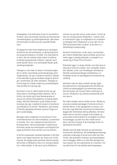 kommer fra og ender ved en anden station, hvorfor de ikke har naturligt ophold i Rødbyhavn. I relation hertil er konklusionen også, at mulighederne for at etablere en biltogsterminal i Rødbyhavn er små, idet man fra DSB og Deutsche Bahn vurderer, at der ikke er et tilstrækkeligt kundegrundlag. Samlet er konklusionen, at der netop i sammenhængen mellem biobrændsel, genanvendelse og havvindmøller ligger et særligt potentiale i at arbejde for en realisering af ”Green Port of Femern”. Potentialet ligger i at skabe aktivitet, som ikke alene er tilknyttet ét af de tre områder, men i samspillet mellem dem således, at det, som kendetegner aktiviteterne tilknyttet produktionsanlægget og Rødbyhavn, er forskellige former for bæredygtig erhvervsaktivitet og udvikling. Aktiviteter inden for disse områder hænger ligeledes godt sammen med igangværende aktiviteter på Lolland om bæredygtighed og vedvarende energi. Dermed skabes der synergi mellem udviklingen af havnen i Rødbyhavn og Lollands eksisterende profil som grøn ø. Det videre arbejde med at udvikle havnen i Rødby og anvende produktionsanlægget til blivende erhvervsaktivitet kræver, at der igangsættes en proces, hvor først den organisatoriske forankring af produktionsanlægget efter forbindelses åbning afdækkes. Dernæst kræver det en nærmere analyse af de juridiske og økonomiske forhold relateret til overtagelse af produktionsanlægget, og sidst men ikke mindst kræver det en nærmere analyse af de forskellige former for specialiseret havnedrift. Således skal alle både nationale og internationale konkurrenter identificeres, det beskæftigelsesmæssige potentiale undersøges til bunds samt sidst men ikke mindst, skal potentielle investorer og samarbejdspartnere kortlægges. Målet er en eller flere færdige business case(s), der kan præsenteres for investorer i indog udland samt for de politiske beslutningstagere.