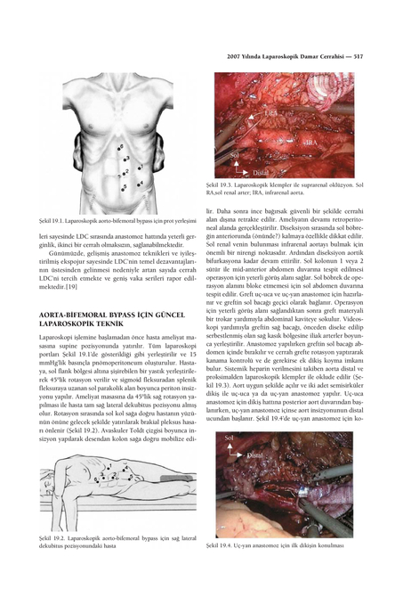 lir. Daha sonra ince ba¤›rsak güvenli bir flekilde cerrahi alan d›fl›na retrakte edilir. Ameliyat›n devam› retroperitoneal alanda gerçeklefltirilir. Diseksiyon s›ras›nda sol böbre¤in anteriorunda (önünde?) kalmaya özellikle dikkat edilir. Sol renal venin bulunmas› infrarenal aortay› bulmak için önemli bir nirengi noktas›d›r. Ard›ndan diseksiyon aortik bifurkasyona kadar devam ettirilir. Sol kolonun 1 veya 2 sütür ile mid-anterior abdomen duvar›na tespit edilmesi operasyon için yeterli görüfl alan› sa¤lar. Sol böbrek de operasyon alan›n› bloke etmemesi için sol abdomen duvar›na tespit edilir. Greft uç-uca ve uç-yan anastomoz için haz›rlan›r ve greftin sol baca¤› geçici olarak ba¤lan›r. Operasyon için yeterli görüfl alan› sa¤land›ktan sonra greft materyali bir trokar yard›m›yla abdominal kaviteye sokulur. Videoskopi yard›m›yla greftin sa¤ baca¤›, önceden diseke edilip serbestlenmifl olan sa¤ kas›k bölgesine iliak arterler boyunca yerlefltirilir. Anastomoz yap›l›rken greftin sol baca¤› abdomen içinde b›rak›l›r ve cerrah grefte rotasyon yapt›rarak kanama kontrolü ve de gerekirse ek dikifl koyma imkan› bulur. Sistemik heparin verilmesini takiben aorta distal ve proksimalden laparoskopik klempler ile oklude edilir (fiekil 19.3). Aort uygun flekilde aç›l›r ve iki adet semisirküler dikifl ile uç-uca ya da uç-yan anastomoz yap›l›r. Uç-uca anastomoz için dikifl hatt›na posterior aort duvar›ndan bafllan›rken, uç-yan anastomoz içinse aort insizyonunun distal ucundan bafllan›r. fiekil 19.4’de uç-yan anastomoz için koSol