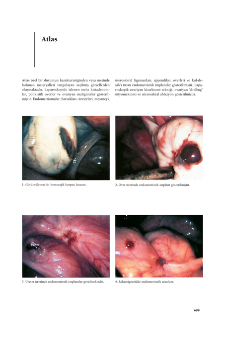 Atlas özel bir durumun karakteristi¤inden veya metinde bulunan materyalleri vurgulayan seçilmifl görsellerden oluflmaktad›r. Laparoskopide izlenen seröz kistadenomlar, polikistik overler ve ovariyan maligniteler gösterilmifltir. Endometriomalar, barsaklar›, üreterleri, mesaneyi,