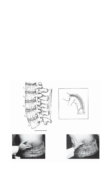 kadar büyüktür (ùekil 10-1). Beúinci lomber vertebra en az hareketli segmenttir. Popülasyonun %5'inde beúinci lomber vertebra konjenital olarak sakrumla birleúmiútir. Bu duruma sakralizas- yon adû verilir. Sakralizasyon hastalarûnda sadece dört lomber spinöz çûkûntû vardûr. Bazû insan- larda ise, birinci sakral segment diýer segmentlerle kaynaúmamûútûr. Bu duruma lumbalizasyon adû verilir. Lumbalizasyonu bulunan hastalarda lomber omurgada palpe edilen altû spinöz çûkûntû olabilir. Spina bifida, lomber spinöz çûkûntûlarûn yaygûn bir konjenital anomalisidir Popülasyo- nun %10'unda bulunur. Spina bifida vertebral arkûn büyüme ve kemikleúme yetersizliýi sonucu oluúur. L5 veya S1 segmentinde yaygûndûr. L4-L5 veya L5-S1 aralûkta diýer bir yaygûn anomali spondilolistezistir. Pars interartikularisin kûrûýû sebebiyle bir vertebranûn diýeri üzerinde öne doý- ru hareketine neden olur. palpe edin (ùekil 10-2). þlk olarak spondilolistezis, spina bifida, lumbalizasyon veya sakralizasyon gibi herhangi bir patoloji varlûýûnû araútûrûn. Sonrasûnda baúparmakla her bir çûkûntûya anteriora doýru baskû yapûn (ùekil 10-3) ve sertlik veya yaylanma varsa not edin. Sertlik hareket kûsûtlûlûýûnû, yaylanma hissi ise aúûrû harekete iúaret edebilir. spinöz çikintilar fleksiyon |