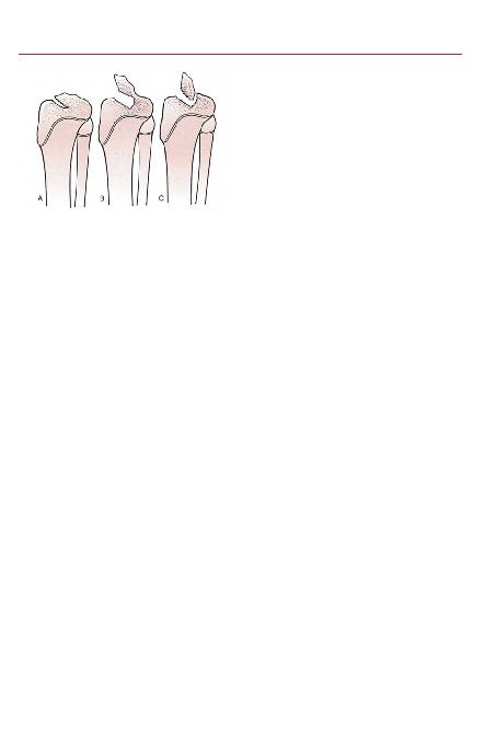 ¤>n proksimal avulsiyonu s>k olmamakla birlikte bildirilmifl- tir. Ayr>lman>n derecelerine dayanan Meyers ve McKeever'in mak için kullan>l>r (fiekil 24-2): 1. Tip 1--Proksimal tibial epifîzin kalan k>sm>ndan fragma- man>n 1/3 veya yar>s>n>n yer de¤ifltirmesi. ya yer de¤ifltirmifl ve donmufltur. tip 3 aras>ndaki güvenilirlik iyidir ancak tip 2 ve 3 k>r>klar aras>ndaki ay>r>m zor olabilir. m>d>r. Bu üçgen, proksimal tibian>n anterior s>n>r>na daya- n>r. Geliflmemifl iskelette eminans>n proksimal yüzeyi k>k>r- dakla tamamen kaplan>r. Anterior çarpraz ba¤ ayr> anterior ve lateral ç>kmalarla anterior tibial spina distaline tutunur. (fiekil 24-4) Ba¤, interkondiler çenti¤in lateral yüzünün pos- terior kenar>ndan köken al>r. Lateral menisküsün anterior boynuzu genel olarak anterior çarpraz ba¤ oluflumunda in- terkondiler eminans bölgesine tutunur. Lowe ve ark. 12 hastada lateral menisküsün anterior boynuzunun tibial eminans k>r>k parças>na tutunmufl bir flekilde kald>¤>n> gös- termifllerdir. Posterior çarpraz ba¤, interkondiler çenti¤in medial yüzünden köken al>r ve ba¤ hatt> distal seviyede prok- simal tibian>n posterior yüzü üzerinde oluflur. spina k>r>klar>nda aç>k veya artroskopik redüksiyonu yapar- ken bu önemli olabilir (fiekil 24-5). ve artm>fl anterior gevfleme veya ekstansiyon k>s>tl>l>¤> ile so- nuçlanabilir. lir. rasyon vakalar>n> kaydetmifllerdir.Tibial spina k>r>klar>nda meniskal tutunma ayr>lm>fl k>r>klardan daha s>kt>r. Bir öngö- rü olarak, lateral menisküsün anterior boynuzu genel olarak tibial eminans k>r>k fragman>na tutunarak kal>r. Buna ra¤- men medial menisküsün anterior boynuzu veya intermenis- kal ba¤ s>k>flm>fl hale gelebilir. Mah ve ark. medial menisküs tutunmas>n> tesbit etmifllerdir. Kocher ve ark. geliflimini tamamlamam>fl 80 hastal>k bir çal>flmada, ayr>lma- m>fl (tip 2) k>r>klar>n %26's>nda (6/23) ve ayr>lm>fl (tip 3) k>- r>klar>n %65'inde (37/57) medial menisküsün anterior boy- nuzu (n=36), intermeniskal ba¤ (n=6) veya lateral meniskü- sün anterior boynuzunun (n=1) tutundu¤unu göstermifller- dir. Tutunan menisküs genel olarak bir artroskopik prob ile ç>kar>labilir ve elde tutulan bir sütür ile geri çekilebilir (fiekil 24-6). cünün vida tesbitinden yüksek oldu¤u gösterilmifltir. l> redüksiyon genelde dizin tam ekstansiyonu ya da 20 ile 30 derecelik fleksiyon ile yerlefltirilmesiyle birlikte hematomun aspirasyonundan sonra gerçeklefltirilir. Redüksiyonun yeter- lili¤ini de¤erlendirmek için radyografiler kullan>l>r. E¤er k>r>k fragman> medial ya da lateral tibial platoya do¤ru uzan>rsa, ekstansiyon, medial veya lateral kondil uyumu ile uygulanan bas>nç redüksiyonu etkileyebilir (fiekil 24-7). K>r>klar inter- kondiler çentik içinde tutulur ama buna ra¤men bu yolla re- dükte edilemez. Dizin bütün fleksiyon pozisyonlar>nda ante- rior çarpraz ba¤ gergindir, bu nedenle anterior çarpraz ba¤a traksiyon uygulamaks>z>n bir pozisyon oluflturulamaz. Medi- al menisküsün anterior boynuzu ya da intermeniskal ba¤>n interpozisyonu redüksiyonu bloke edebilir. kaydetmifltir (26/49). Buna ra¤men, hiçbir tip 3 k>r>¤> kapal> |