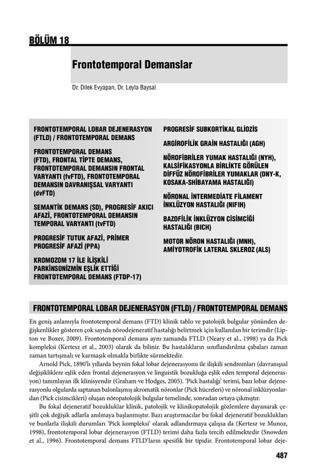 FRONTOTEMPORAL LOBAR DEJENERASYON (FTLD) / FRONTOTEMPORAL DEMANS FRONTOTEMPORAL DEMANS (FTD), FRONTAL TİPTE DEMANS, FRONTOTEMPORAL DEMANSIN FRONTAL VARYANTI (fvFTD), FRONTOTEMPORAL DEMANSIN DAVRANIŞSAL VARYANTI (dvFTD) SEMANTİK DEMANS (SD), PROGRESİF AKICI AFAZİ, FRONTOTEMPORAL DEMANSIN TEMPORAL VARYANTI (tvFTD) PROGRESİF TUTUK AFAZİ, PRİMER PROGRESİF AFAZİ (PPA) KROMOZOM 17 İLE İLİŞKİLİ PARKİNSONİZMİN EŞLİK ETTİĞİ FRONTOTEMPORAL DEMANS (FTDP-17)