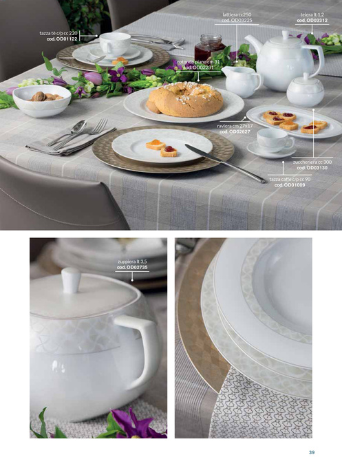 lattiera cc250 cod. O 03225 tazza tè c/p cc 220 cod. OD01122 teiera lt 1,2 cod. OD03312 rotondo piano cm 31 cod. O 02231 raviera cm 27x17 cod. OD02627 zuccheriera cc 300 cod. OD03130 tazza caffè c/p cc 90 cod. OD01009 zuppiera lt 3,5 cod. OD02735 39