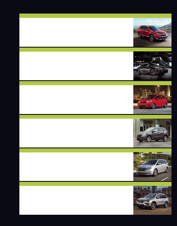 generation of CR-V builds on the fundamental formula of the previous four generations, with its just-right size, features and price. The new CR-V will feature an all-new platform and powertrain - with its first application of turbo-charging, making this one of CR-V's most comprehensive redesigns to date. Visually, this change is characterized by a wider, more broad- shouldered stance, longer wheelbase, more sharply sculpted body and premium detailing including LED headlights and taillights. coexist. With a 39-mpg highway rating and an available 6-speed manual transmission, it's one of the most efficient ways to have fun on four wheels. The CR-Z has leather-trimmed seats that are stylish, comfortable and provide lateral support through twisty turns (EX-L Navi). No need to turn the ignition, press it! The CR-Z can identify when your key is inside the vehicle, and it all starts with the push of a button. The available CVT drives like an automatic, while offering smooth acceleration in addition to impressive fuel efficiency. generation of Honda's versatile 5-door subcompact hatchback. Fit starts at a manufacturer's suggested retail price of $15,990 while continuing to offer the functionality, fun and refinement that defines the model, together with modern styling, a dynamic driving experience and available technology and luxury features. Fundamental to its design, the 2017 Fit offers class-leading passenger volume, cargo volume (52.7 cu. ft. with rear seats down), and versatility, courtesy of its center-mounted fuel tank and ingenious Magic Seat®. credentials. With bold and sporty coupe-like styling, SUV versatility and a 34-mpg EPA highway fuel economy rating (2WD CVT), by any measure the 2017 Honda HR-V is a standout in the entry crossover market. Delivering outstanding value with a long list of standard features and technologies, including 17-inch alloy wheels, push-button electric parking brake with Automatic Brake Hold, rearview camera, Pandora® radio and Bluetooth® HandsFreeLink®, the 2017 HR-V also adds a sophisticated new color Lunar Silver metallic to its palette. customers a high-value proposition, building on the well-equipped EX to enhance in-vehicle entertainment and convenience with several premium features found in higher trims. The Odyssey's interior is ideal for families, with high-grade meter illumination and interior lighting, chrome-trimmed instrument dials and door handles, an available 7-inch touchscreen, and an ideally positioned DVD player for the available Rear Entertainment System. All Odyssey models and trim levels include a rearview camera. with fresh updates to the award-winning Honda Pilot for the 2017 model year. The 2017 Pilot is available with Apple CarPlayTM and Android AutoTM functionality, a new fingerprint resistant touchscreen and an expanded interior color palette. The Pilot features comfortable seating for up to eight passengers and a cargo area that can hold an 82-quart cooler without compromising third-row seating capability. Third-row entry and exit is easy and intuitive courtesy of the available one-touch second-row seat on EX-L and above models, and large third-row entryway. |