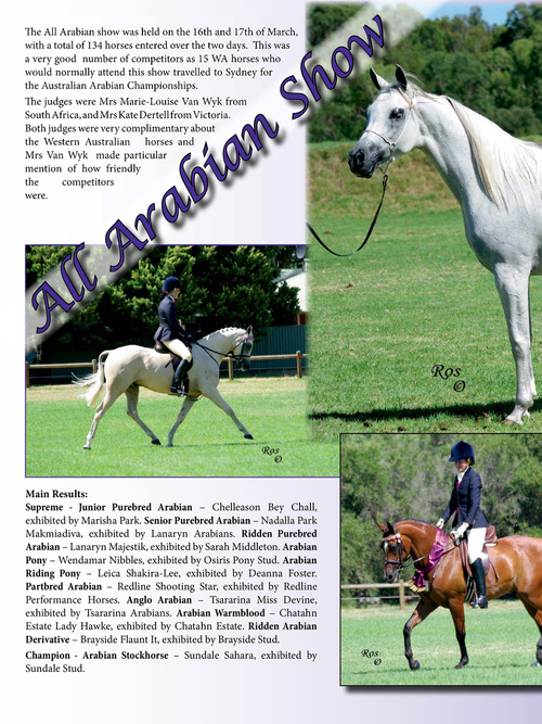 e All Arabian show was held on the 16th and 17th of March, with a total of 134 horses entered over the two days. is was a very good number of competitors as 15 WA horses who would normally attend this show travelled to Sydney for the Australian Arabian Championships. e judges were Mrs Marie-Louise Van Wyk from South Africa, and Mrs Kate Dertell from Victoria. Both judges were very complimentary about the Western Australian horses and Mrs Van Wyk made particular mention of how friendly the competitors were.