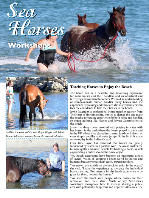e beach can be a beautiful and rewarding experience for some horses and their handlers and an unnatural and terrifying environment for others. Without an understanding or compassionate human handler many horses nd the experience distressing and there are also many handlers who lack the con dence to take their horses to the beach. Jayne Lavender, a professional Horsemanship teacher from e Heart of Horsemanship, wanted to change this and make the beach a rewarding experience for both horse and handler, so began teaching ‘Sea-Horses’ and Private Consultations at the beach. Jayne has always been involved with playing in water with her horses; in the bush where the horses played in dams and in the UK where they played in streams, ords and rivers, or even simply puddles and water jumps. So in Perth it made sense to play in the Indian Ocean! Over time Jayne has observed that horses are greatly in uenced by water, in a positive way. e ocean makes the human lighter and more exible for backing a horse, as well as providing a bu er should the horse object! WA Beach excursions have become an important aspect of Jayne’s vision of creating a better world for horses and humans: because words don’t teach, experience does. “We never rush to ride on the beach or swim in the ocean,” she said. “I take the experience at the pace the individual horse is setting. Our intent is for the beach experience to be great for them, not just the human.” “We share the beach with people whose horses are their recreation and their slave. Much of my Sea-Horses workshops incorporate how to manage sharing a public area with potentially dangerous and negative in uences. e