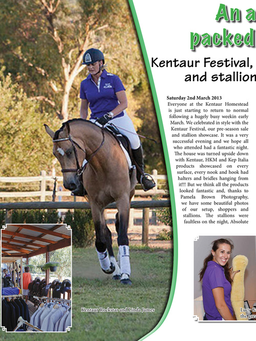 Saturday 2nd March 2013 Everyone at the Kentaur Homestead is just starting to return to normal following a hugely busy weekin early March. We celebrated in style with the Kentaur Festival, our pre-season sale and stallion showcase. It was a very successful evening and we hope all who attended had a fantastic night. e house was turned upside down with Kentaur, HKM and Kep Italia products showcased on every surface, every nook and hook had halters and bridles hanging from it!!! But we think all the products looked fantastic and, thanks to Pamela Brown Photography, we have some beautiful photos of our setup, shoppers and stallions. e stallions were faultless on the night, Absolute