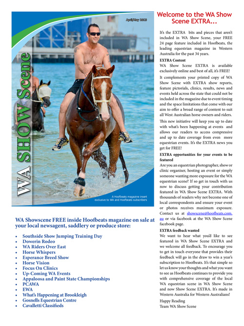 It’s the EXTRA bits and pieces that aren’t included in WA Show Scene, your FREE 24 page feature included in Hoo eats, the leading equestrian magazine in Western Australia for the past 34 years. EXTRA Content WA Show Scene EXTRA is available exclusively online and best of all, it’s FREE! It complements your printed copy of WA Show Scene with EXTRA show reports, feature pictorials, clinics, results, news and events held across the state that could not be included in the magazine due to event timing and the space limitations that come with our aim to o er a broad range of content to suit all West Australian horse owners and riders. is new initiative will keep you up to date with what’s been happening at events and allows our readers to access compressive and up to date coverage from even more equestrian events. It’s the EXTRA news you get for FREE! EXTRA opportunities for your events to be featured Are you an equestrian photographer, show or clinic organiser, hosting an event or simply someone wanting more exposure for the WA equestrian scene? If so get in touch with us now to discuss getting your contribution featured in WA Show Scene EXTRA. With thousands of readers why not become one of local correspondents and ensure your event or photos receives maximum exposure. Contact us at showscene@hoo eats.com. au or via facebook at the WA Show Scene facebook page. EXTRA feedback wanted We want to hear what you’d like to see featured in WA Show Scene EXTRA and we welcome all feedback. To encourage you to get in touch everyone that provides their feedback will go in the draw to win a year’s subscription to Hoo eats. It’s that simple so let us know your thoughts and what you want to see as Hoo eats continues to provide you with comprehensive coverage of the local WA equestrian scene in WA Show Scene and now Show Scene EXTRA. It’s made in Western Australia for Western Australians! Happy Reading Team WA Show Scene
