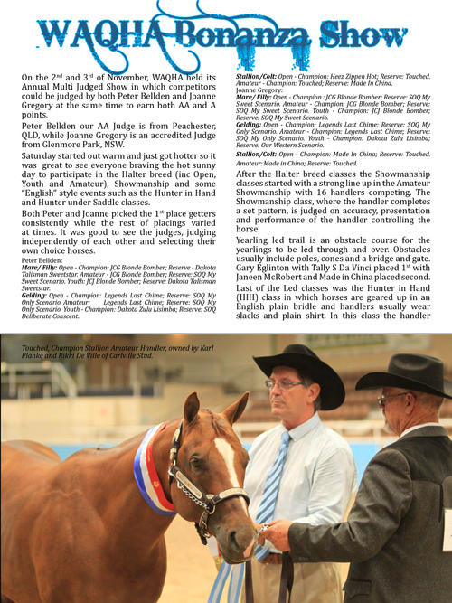 Stallion/Colt: Open - Champion: Heez Zippen Hot; Reserve: Touched. Amateur - Champion: Touched; Reserve: Made In China. Joanne Gregory: Mare/ Filly: Open - Champion : JCG Blonde Bomber; Reserve: SOQ My Sweet Scenario. Amateur - Champion: JCG Blonde Bomber; Reserve: SOQ My Sweet Scenario. Youth - Champion: JCJ Blonde Bomber; Reserve: SOQ My Sweet Scenario. Gelding: Open - Champion: Legends Last Chime; Reserve: SOQ My Only Scenario. Amateur - Champion: Legends Last Chime; Reserve: SOQ My Only Scenario. Youth - Champion: Dakota Zulu Lisimba; Reserve: Our Western Scenario. Stallion/Colt: Open - Champion: Made In China; Reserve: Touched. Amateur: Made in China; Reserve: Touched.