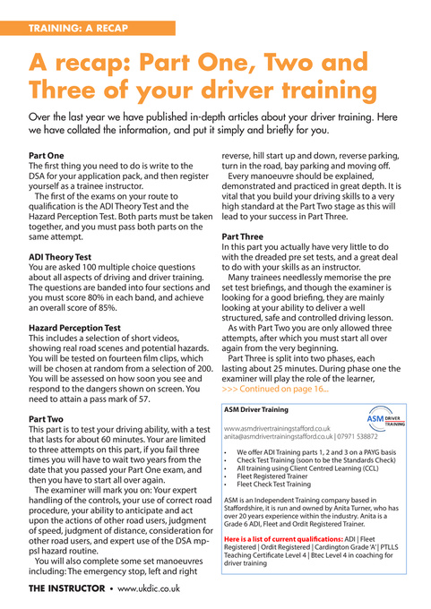 Part Three In this part you actually have very little to do ADI Theory Test with the dreaded pre set tests, and a great deal You are asked 100 multiple choice questions to do with your skills as an instructor. about all aspects of driving and driver training. Many trainees needlessly memorise the pre The questions are banded into four sections and set test briefings, and though the examiner is you must score 80% in each band, and achieve looking for a good briefing, they are mainly an overall score of 85%. looking at your ability to deliver a well structured, safe and controlled driving lesson. Hazard Perception Test As with Part Two you are only allowed three This includes a selection of short videos, attempts, after which you must start all over showing real road scenes and potential hazards. again from the very beginning. You will be tested on fourteen film clips, which Part Three is split into two phases, each will be chosen at random from a selection of 200. lasting about 25 minutes. During phase one the You will be assessed on how soon you see and examiner will play the role of the learner, respond to the dangers shown on screen. You >>> Continued on page 16... need to attain a pass mark of 57. Part Two This part is to test your driving ability, with a test that lasts for about 60 minutes. Your are limited to three attempts on this part, if you fail three times you will have to wait two years from the date that you passed your Part One exam, and then you have to start all over again. The examiner will mark you on: Your expert handling of the controls, your use of correct road procedure, your ability to anticipate and act upon the actions of other road users, judgment of speed, judgment of distance, consideration for other road users, and expert use of the DSA mppsl hazard routine. You will also complete some set manoeuvres including: The emergency stop, left and right