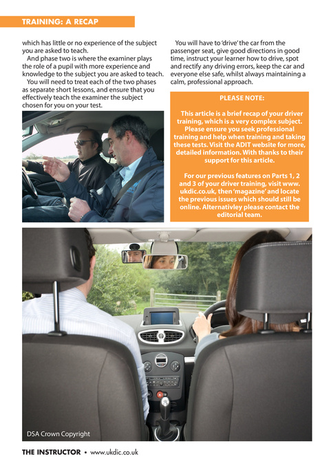 which has little or no experience of the subject you are asked to teach. And phase two is where the examiner plays the role of a pupil with more experience and knowledge to the subject you are asked to teach. You will need to treat each of the two phases as separate short lessons, and ensure that you effectively teach the examiner the subject chosen for you on your test. You will have to ‘drive’ the car from the passenger seat, give good directions in good time, instruct your learner how to drive, spot and rectify any driving errors, keep the car and everyone else safe, whilst always maintaining a calm, professional approach. PLEASE NOTE: This article is a brief recap of your driver training, which is a very complex subject. Please ensure you seek professional training and help when training and taking these tests. Visit the ADIT website for more, detailed information. With thanks to their support for this article. For our previous features on Parts 1, 2 and 3 of your driver training, visit www. ukdic.co.uk, then ‘magazine’ and locate the previous issues which should still be online. Alternativley please contact the editorial team.